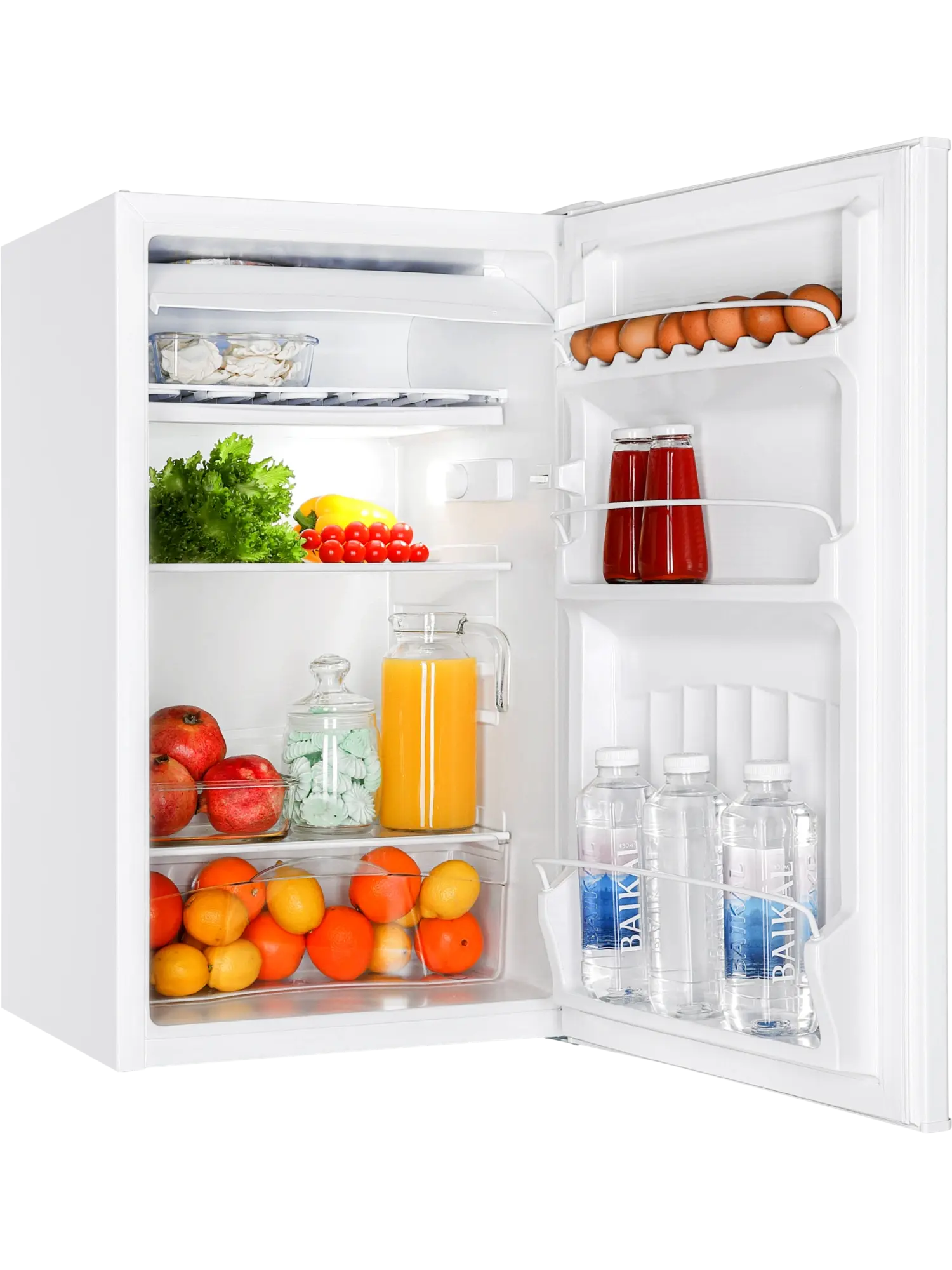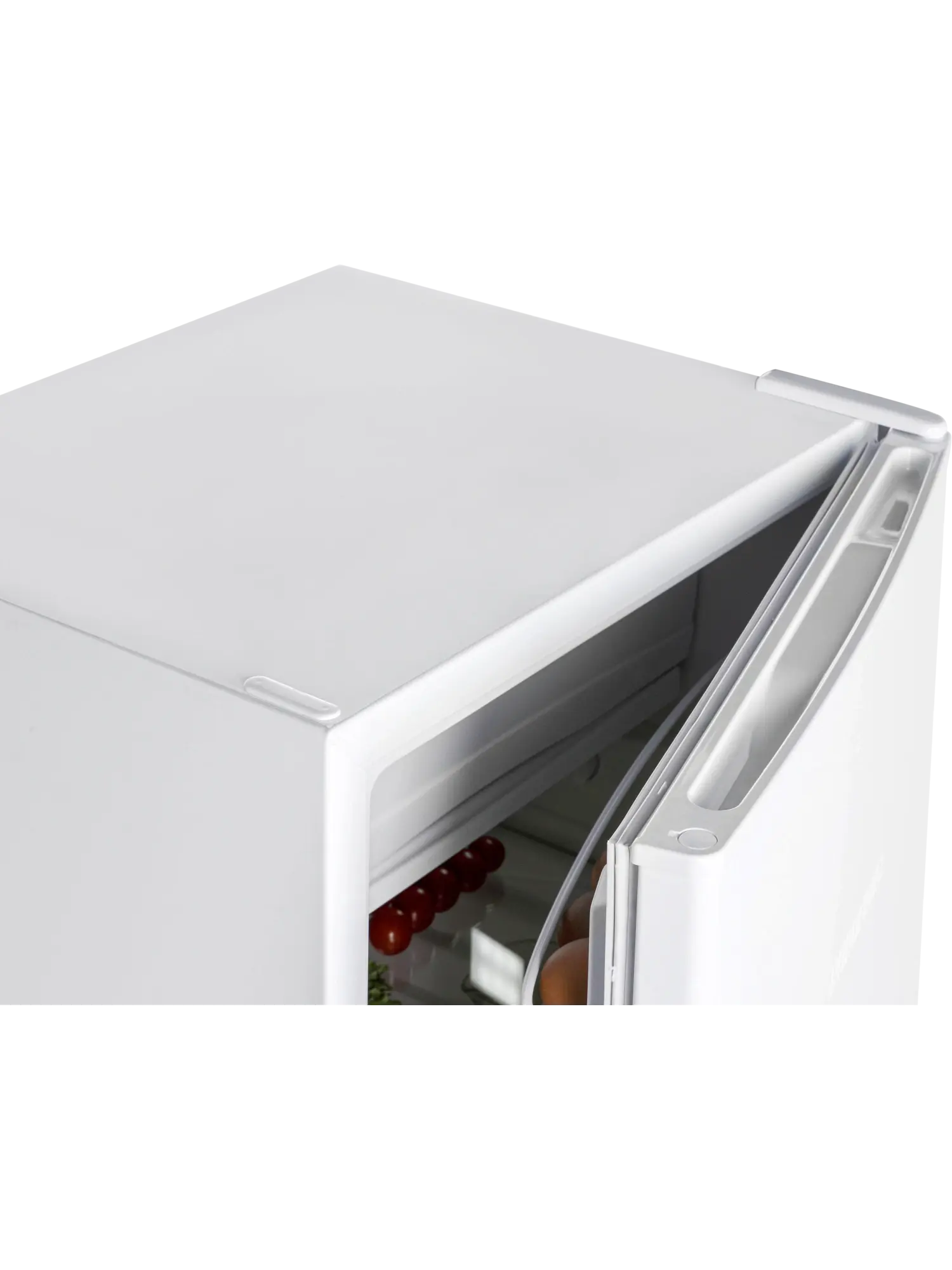 Дверь с интегрированной горизонтальной ручкой имеет возможность перенавешивания на другую сторону для комфортного открывания и установки модели в удобном месте. Корпус холодильника выполнен в белом цвете.