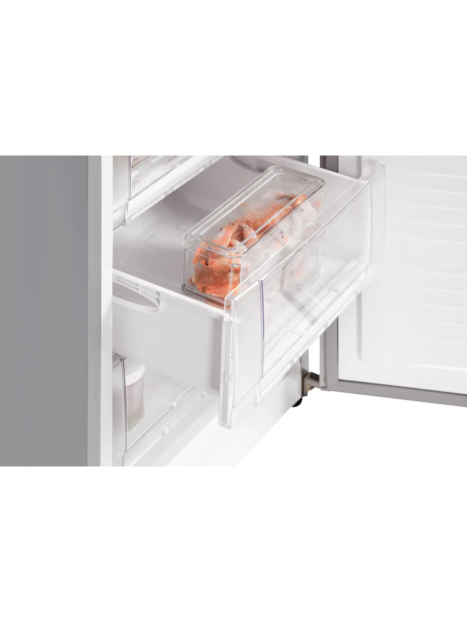 - 3 прозрачных и вместительных ящика в морозильном отделении, где можно длительно хранить большие куски мяса, курицу целиком и другие объемные замороженные продукты;