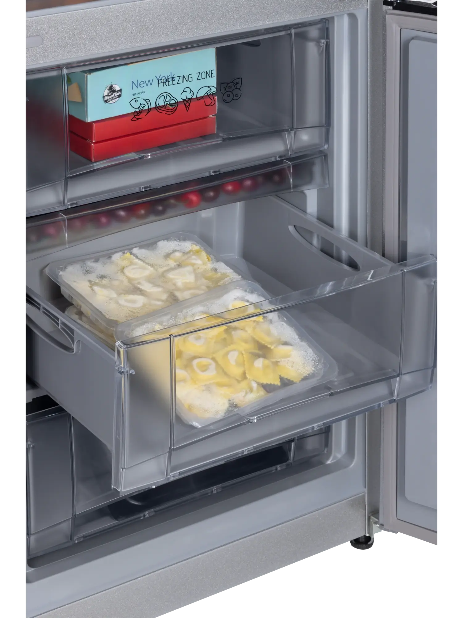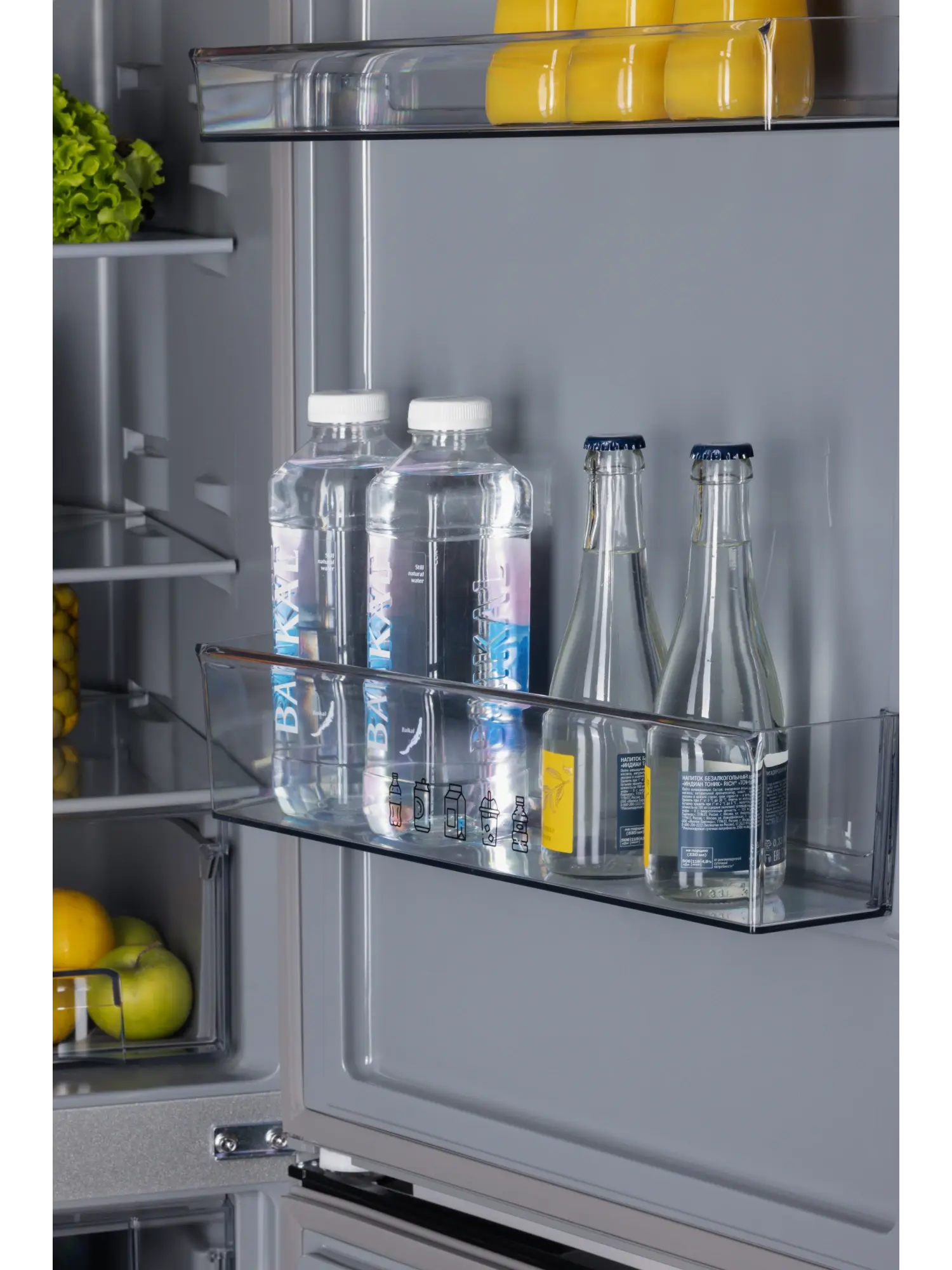 Корпус выполнен в элегантном цвете нержавеющая сталь, а внутренний интерьер холодильника — в стильном сером оформлении. Такое трендовое сочетание создаёт эффект премиальной техники и гармонично вписывается как в современный минимализм, так и в уютную классическую кухню.