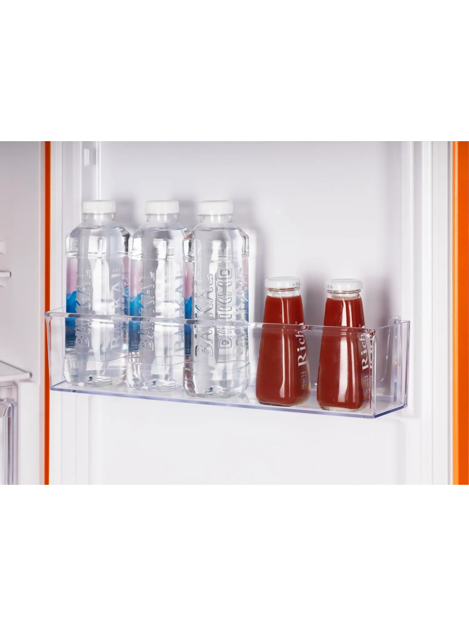 Корпус выполнен в оранжевом матовом цвете с лаконичным дизайном, а удобные пропорции делают холодильник универсальным решением даже для небольшого пространства.