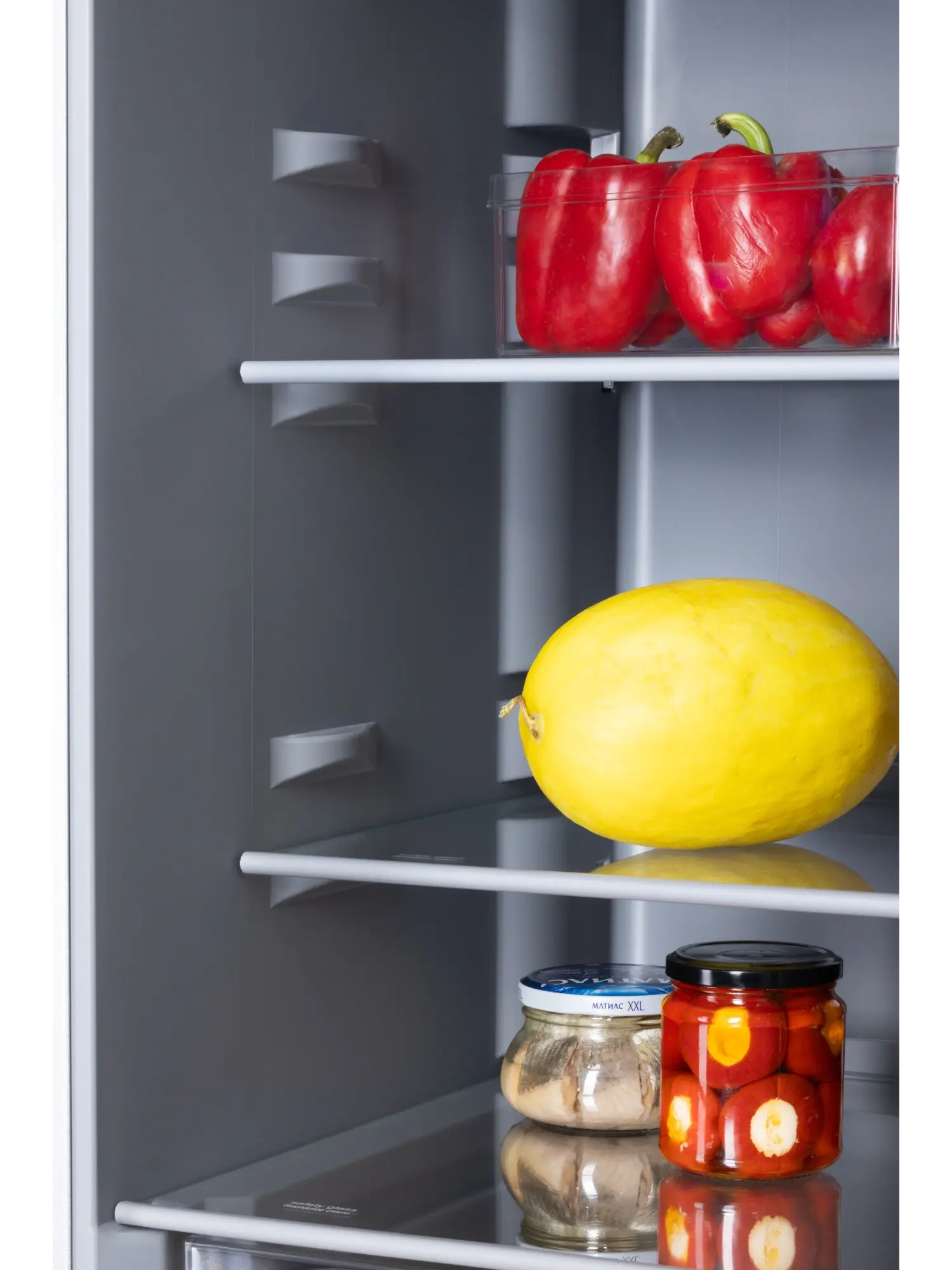 Внутреннее пространство продумано для комфорта: ламинированные стенки с антибактериальным покрытием поддерживают свежесть, LED-подсветка мягко освещает содержимое, четыре полки из закалённого стекла регулируются по высоте и выдерживают нагрузку, а выдвижной ящик сохраняет овощи и фрукты в оптимальном микроклимате. На дверце расположены три полки для бутылок, соусов и упаковок. В морозильной камере — три прозрачных ящика для объёмных заготовок и лоток для ягод.