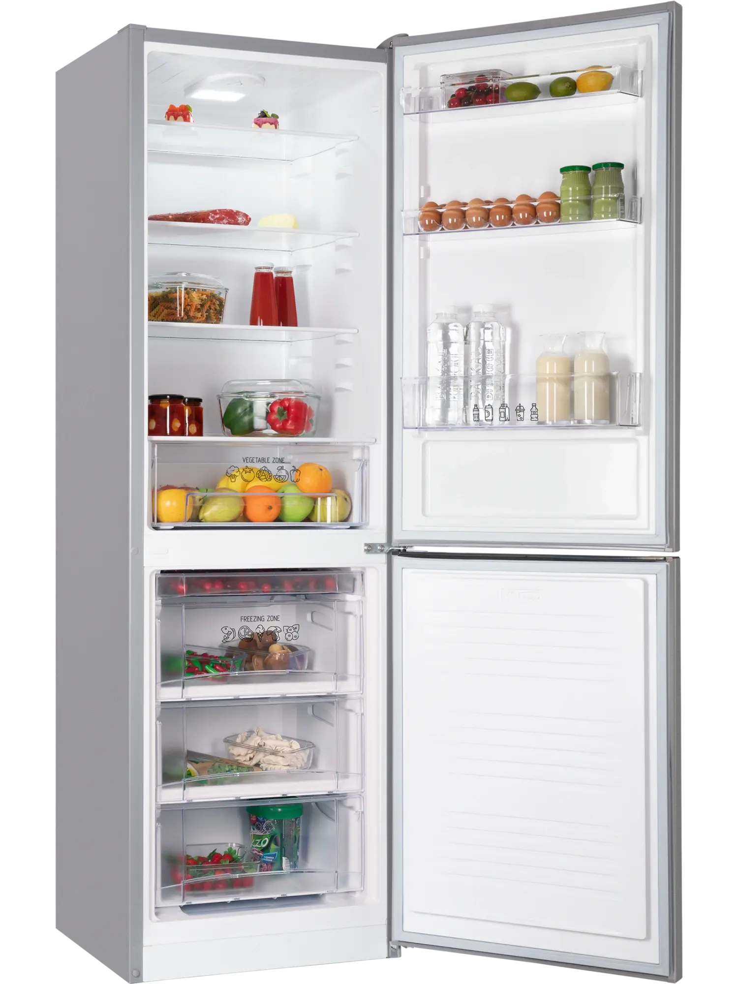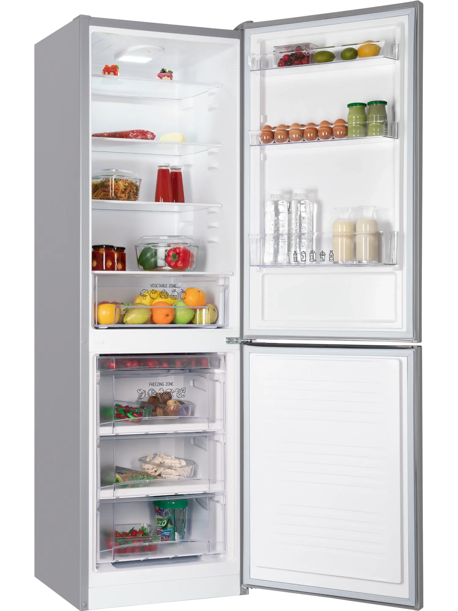 - 3 дверные полки позволяют удобно разместить упаковки, бутылки и соусы;