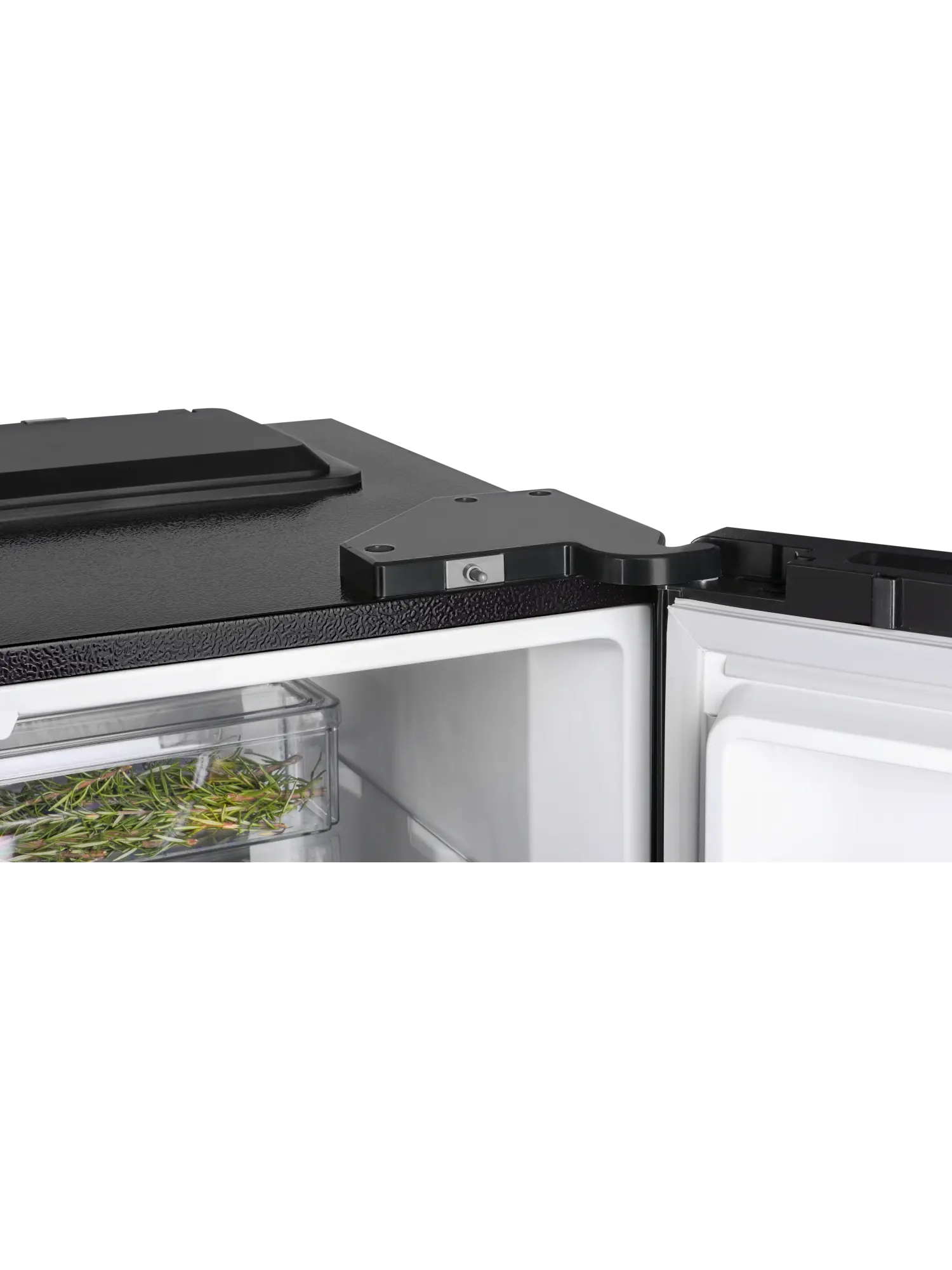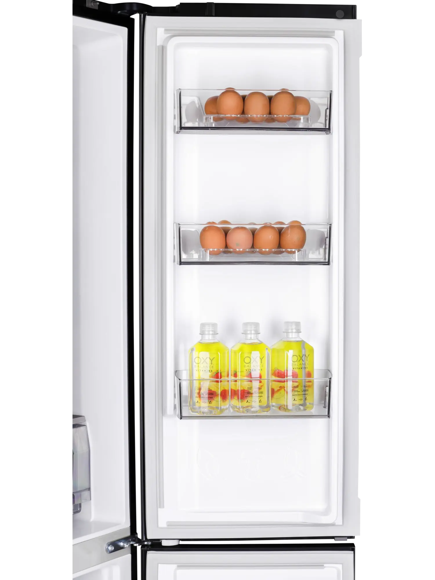 Корпус модели цвета «черное стекло», горизонтальные интегрированные ручки и фантомный дисплей подчеркивают стиль и уникальность модели. Благодаря открытию дверь в дверь и дверного ограничителя, внутри холодильника максимально сохраняется холод. Двери холодильника оснащены системой легкого автоматического закрывания при угле двери в 10 градусов, что соответствует расстоянию до полного закрытия в 6 сантиметров. Это обеспечивает надежную герметизацию для экономии электроэнергии и удобство использования модели.