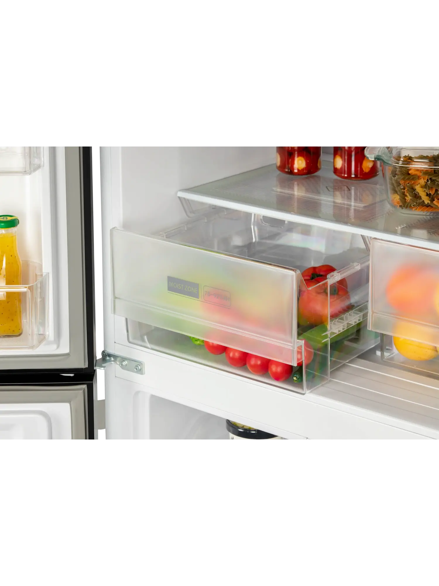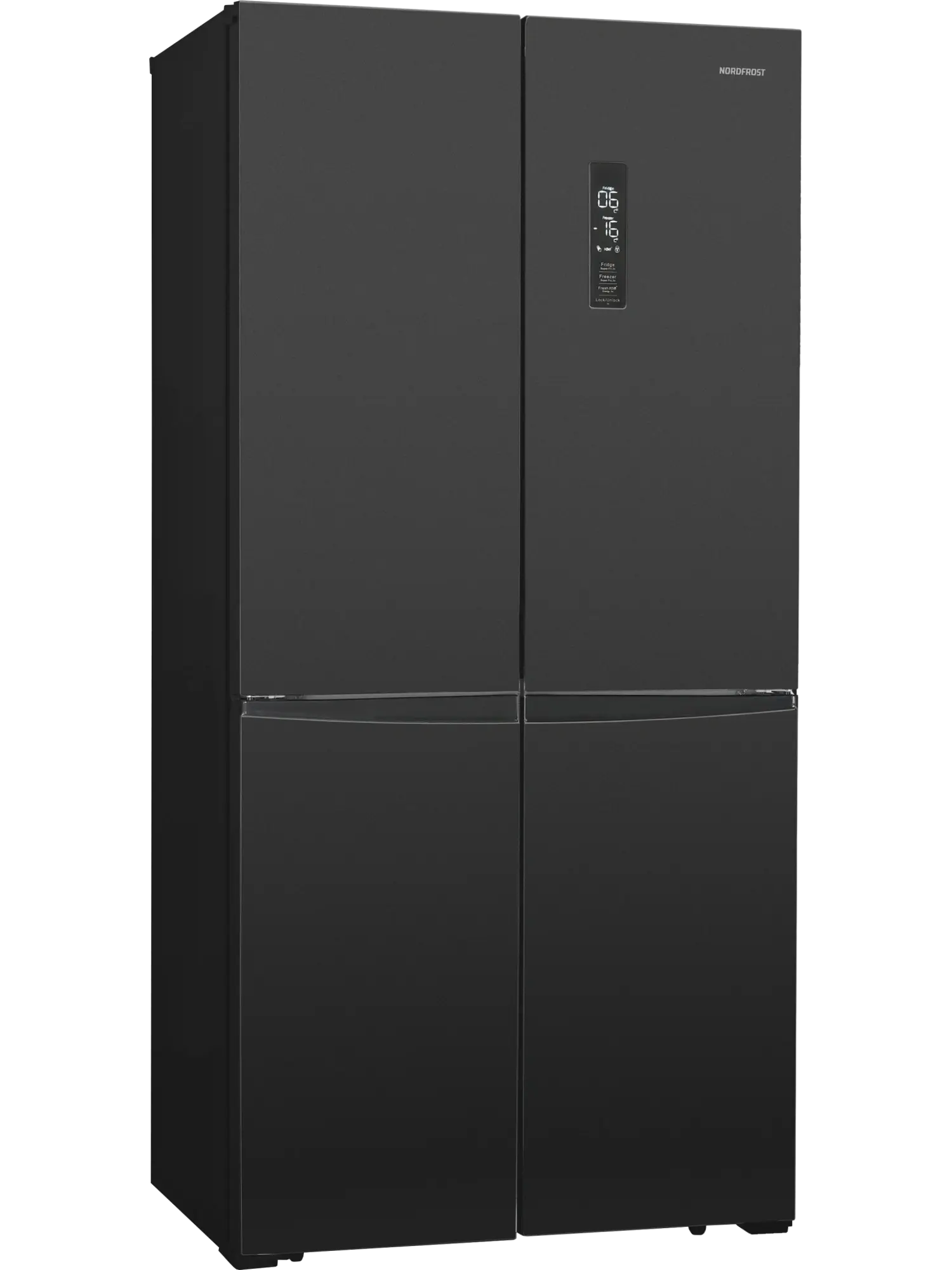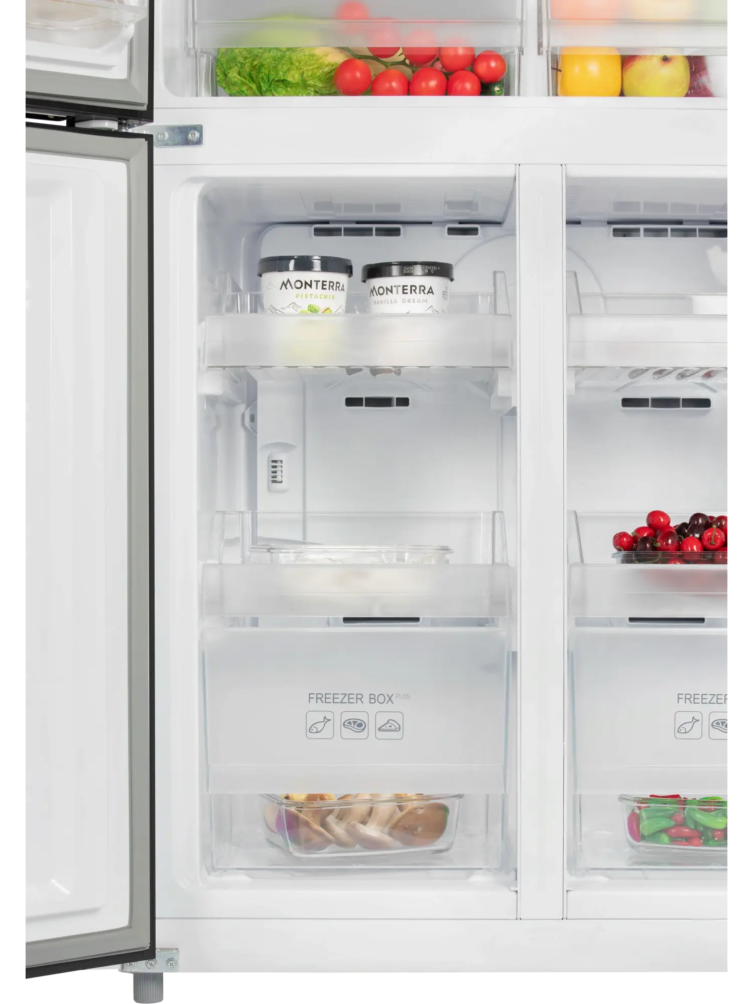 4-х дверный холодильник имеет единое пространство верхних полок холодильной камеры, чтобы удобно было размещать габаритные кастрюли и контейнеры. Прочные полки из закаленного стекла можно регулировать по высоте, а ящики в холодильной камере предназначены для хранения овощей и фруктов и оснащены влажной зоной свежести и сухой.