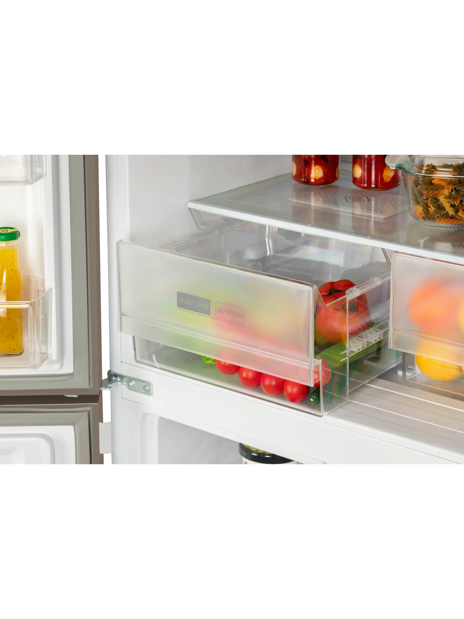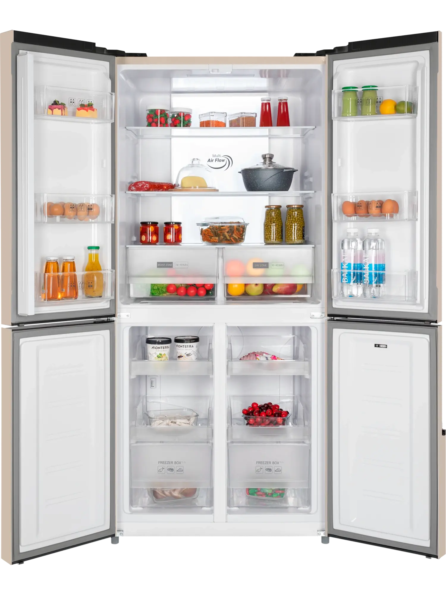 4-х дверный холодильник имеет единое пространство верхних полок холодильной камеры, чтобы удобно было размещать габаритные кастрюли и контейнеры. Прочные полки из закаленного стекла можно регулировать по высоте, а ящики в холодильной камере предназначены для хранения овощей и фруктов и оснащены влажной зоной свежести и сухой.