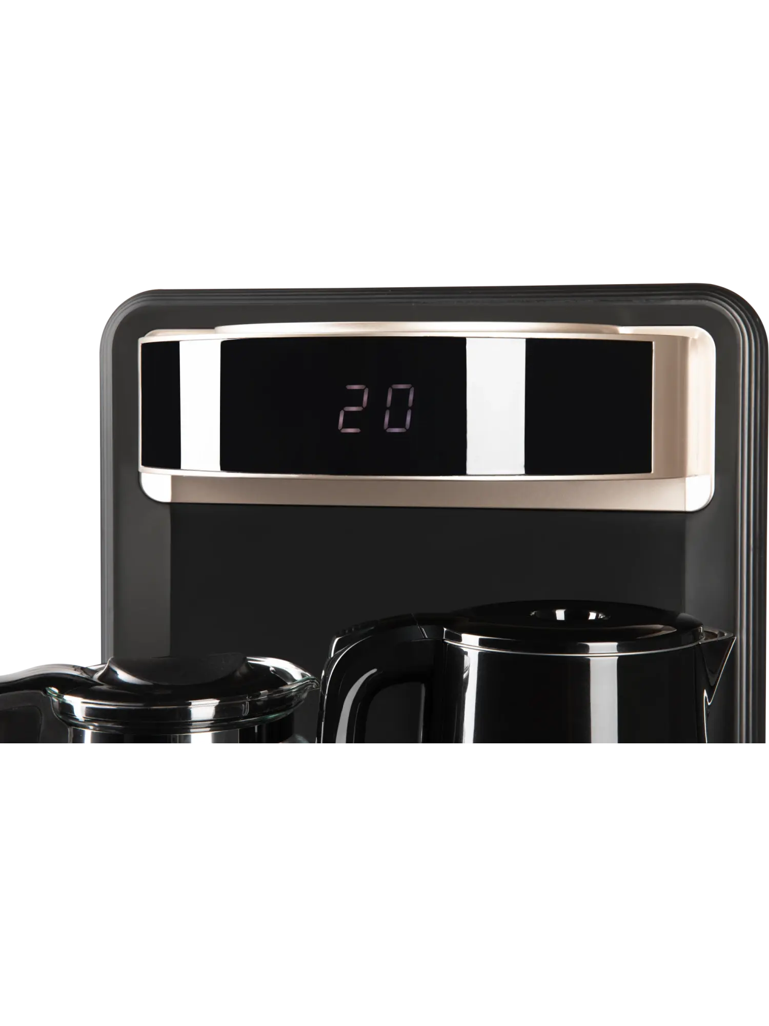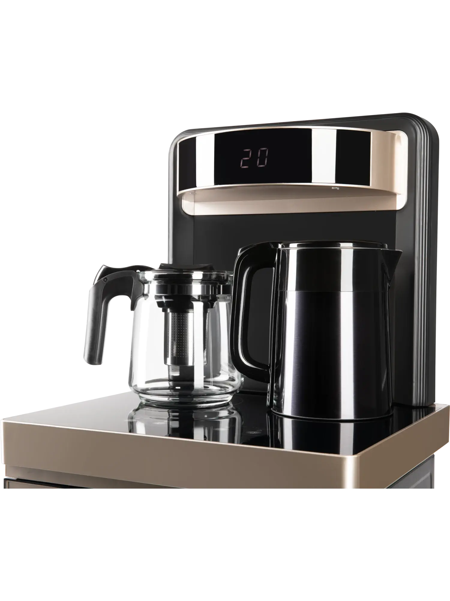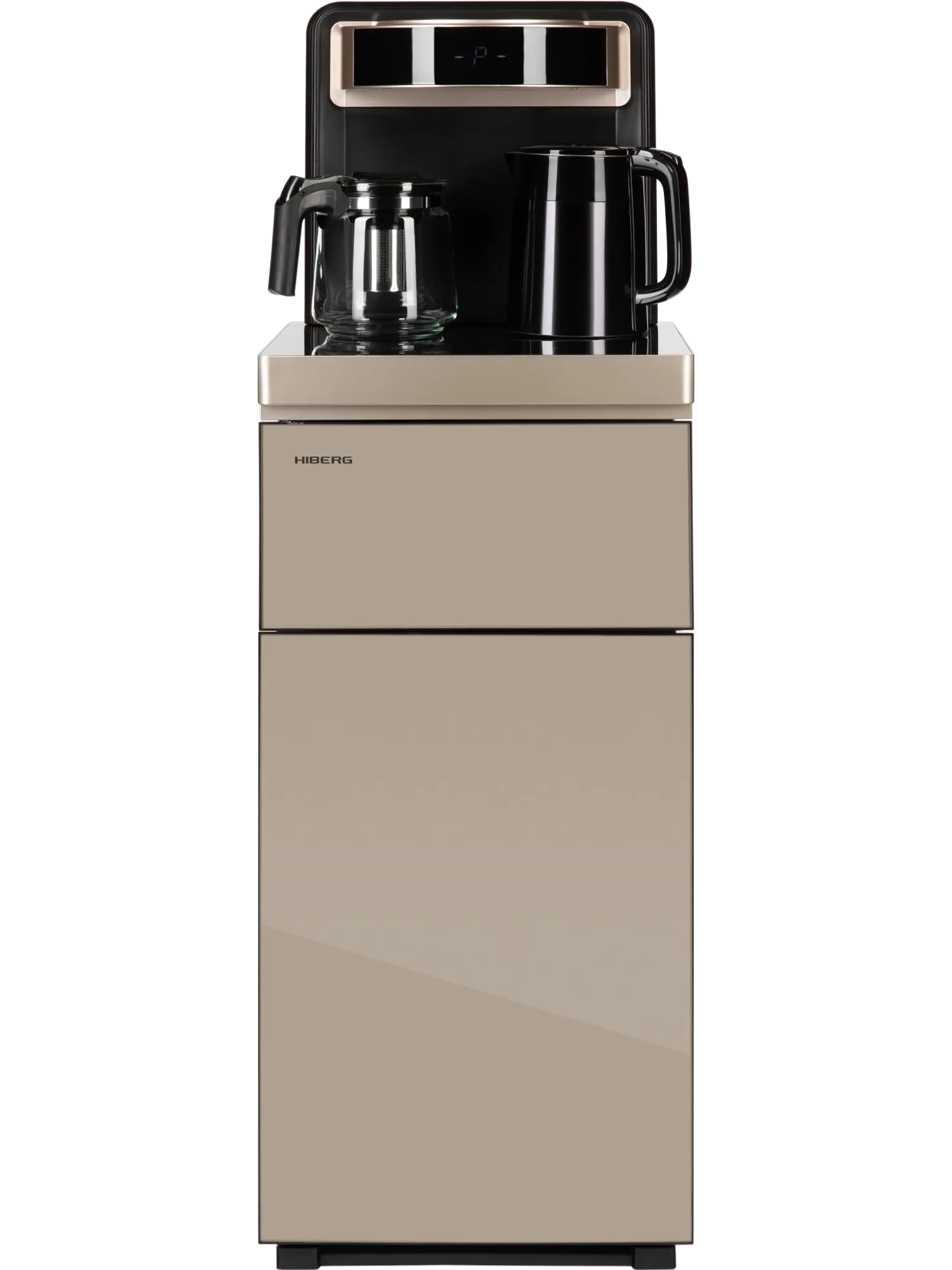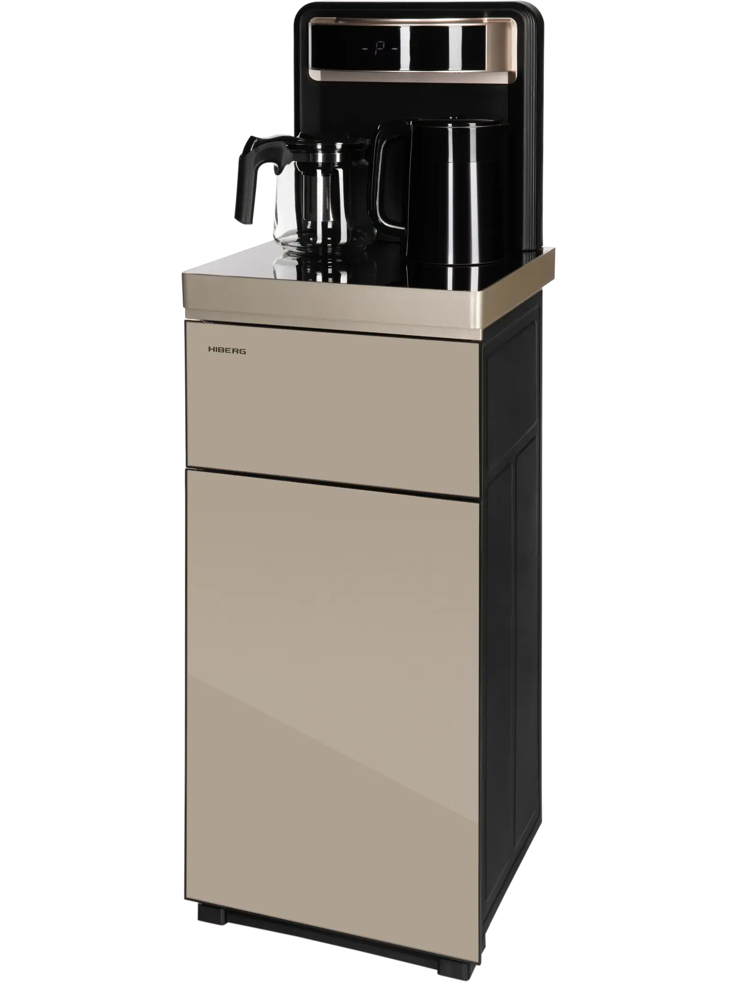 Под столешницей находится небольшой шкафчик объемом 7,5 л для хранения чайных принадлежностей и другой посуды. В нижней части кулера за дверцей расположен отсек для установки бутыли. Скрытая загрузка емкости сэкономит пространство и обеспечит оборудованию эстетичный вид в любом помещении. Кроме того, такое конструктивное решение исключает попадание прямых солнечных лучей в бутыль с водой, предотвращает образование вредных веществ и зацветания воды на дне бутыли. Кулер оснащен кранами для удобного наливания воды, а также столешницей с двумя чайниками — электрическим из нержавеющей стали и стеклянным заварочным. В кранах вода по умолчанию имеет комнатную температуру, но один из них можно легко переключить на охлаждение.