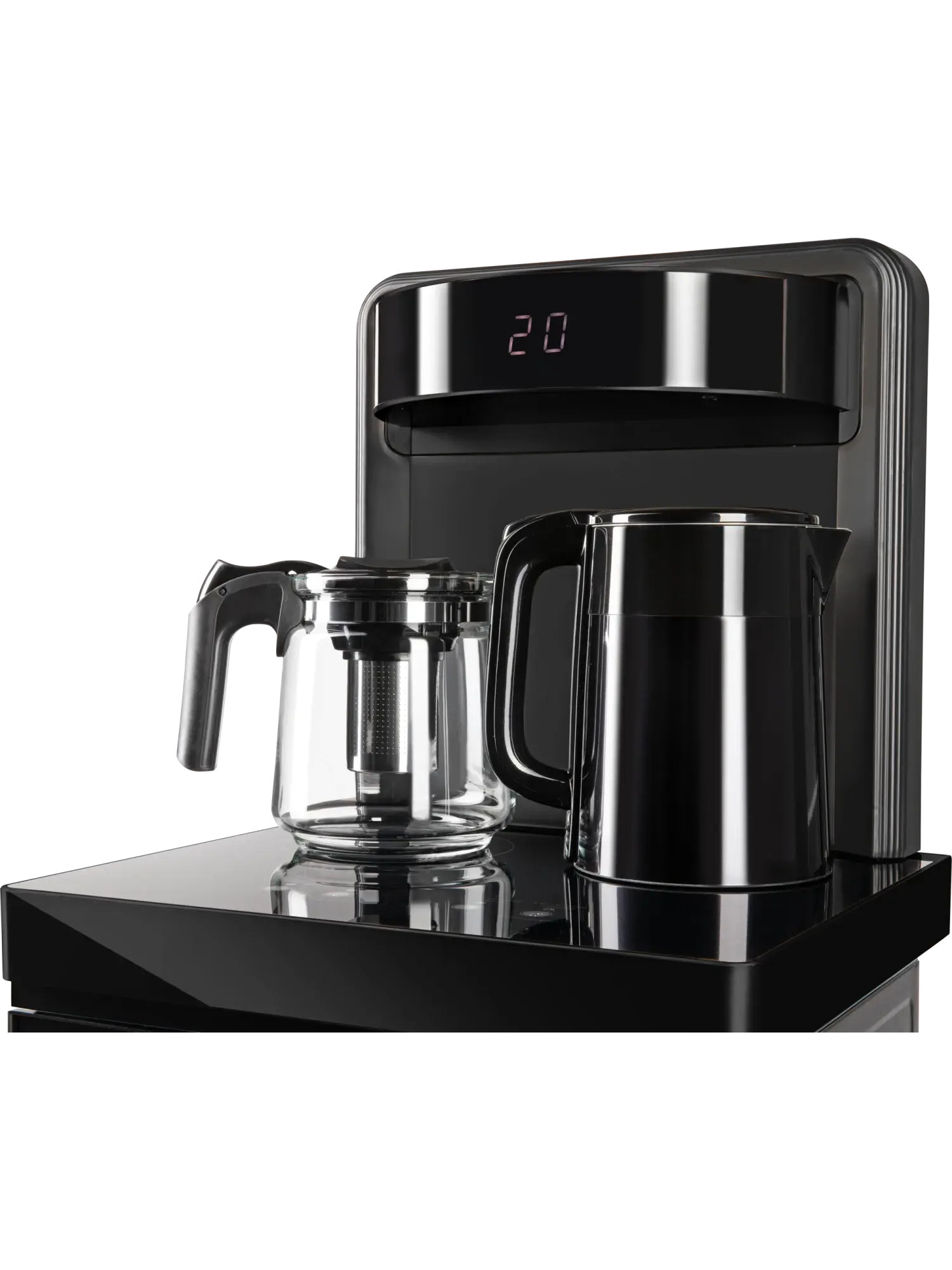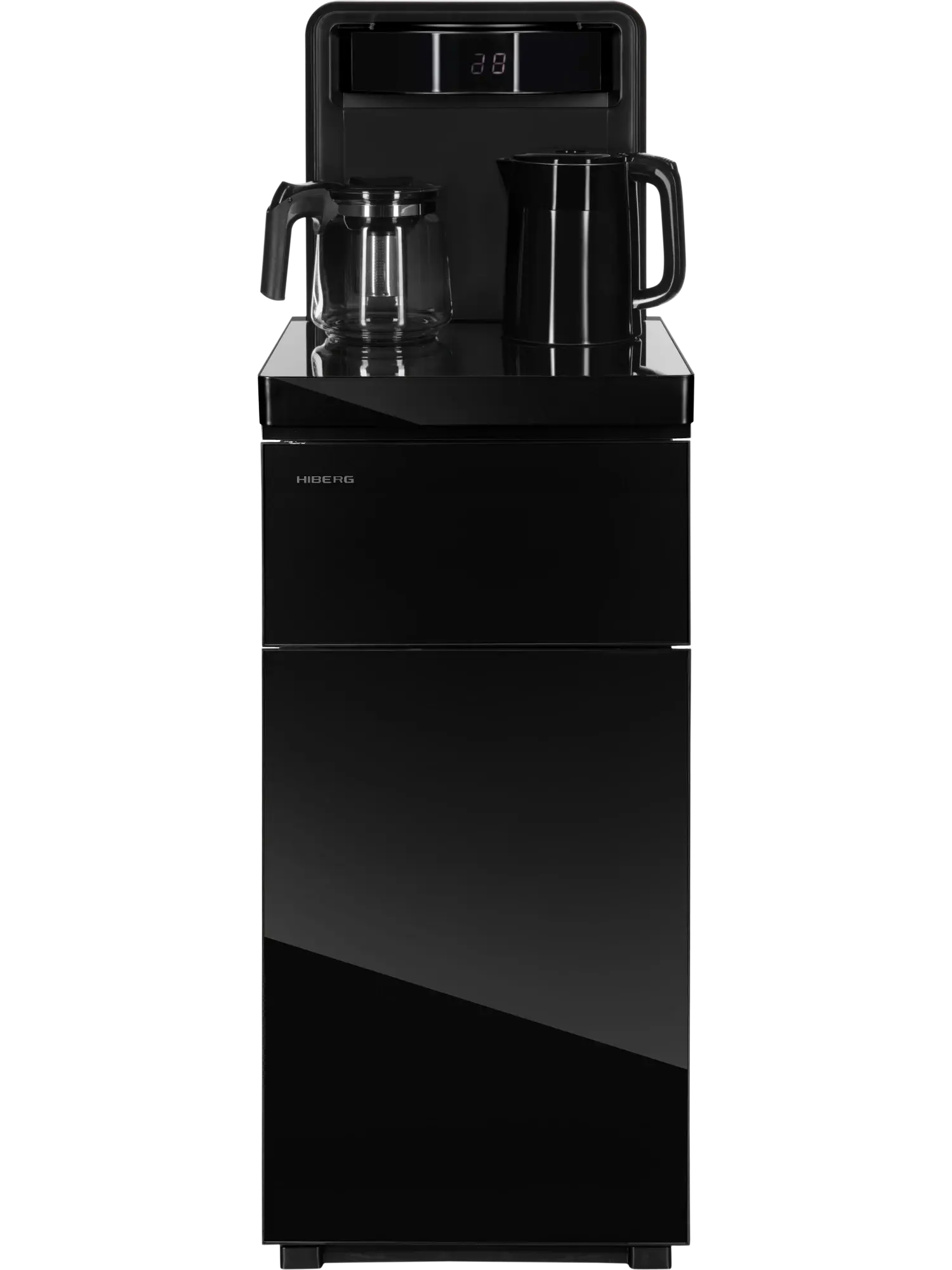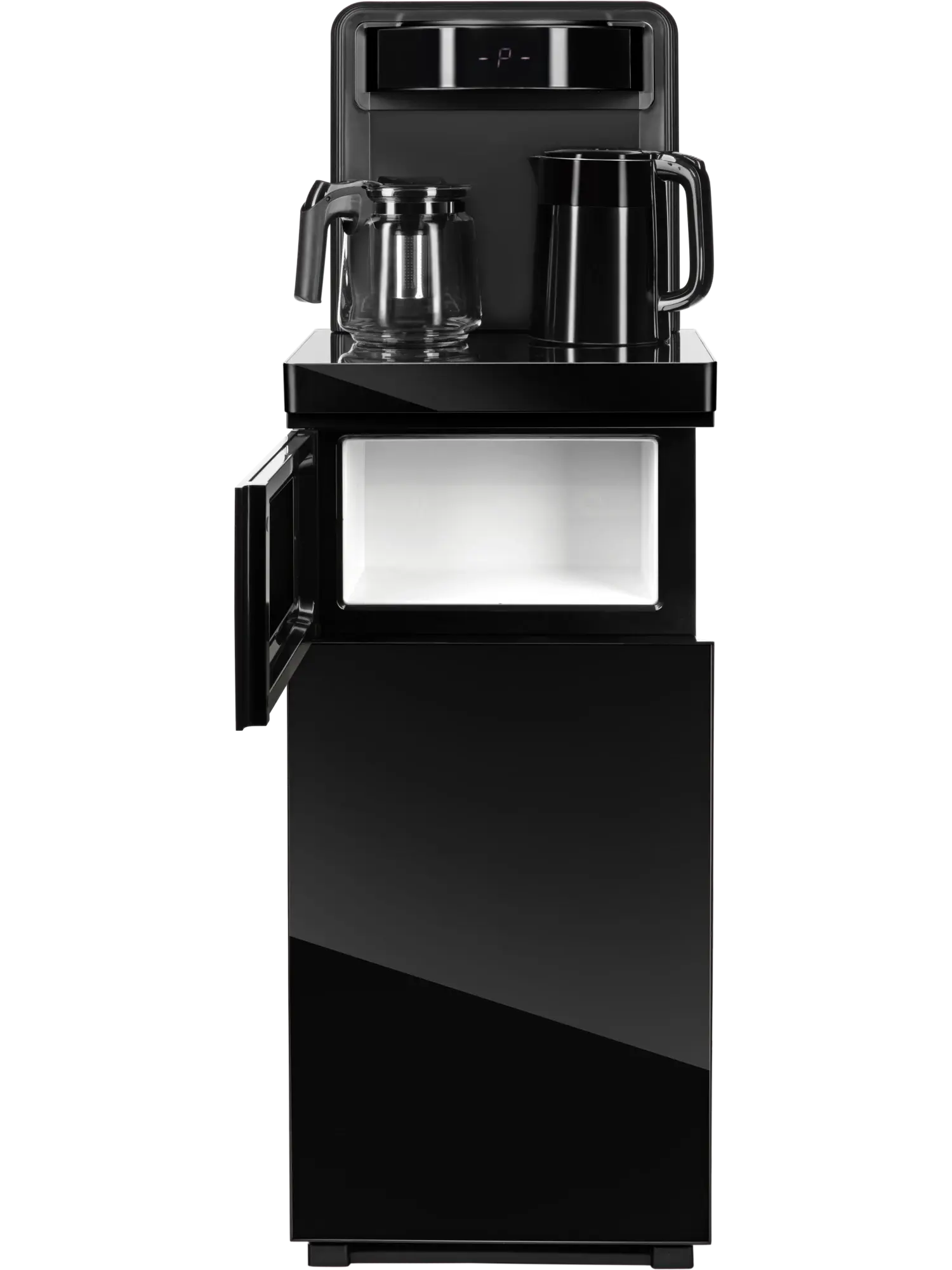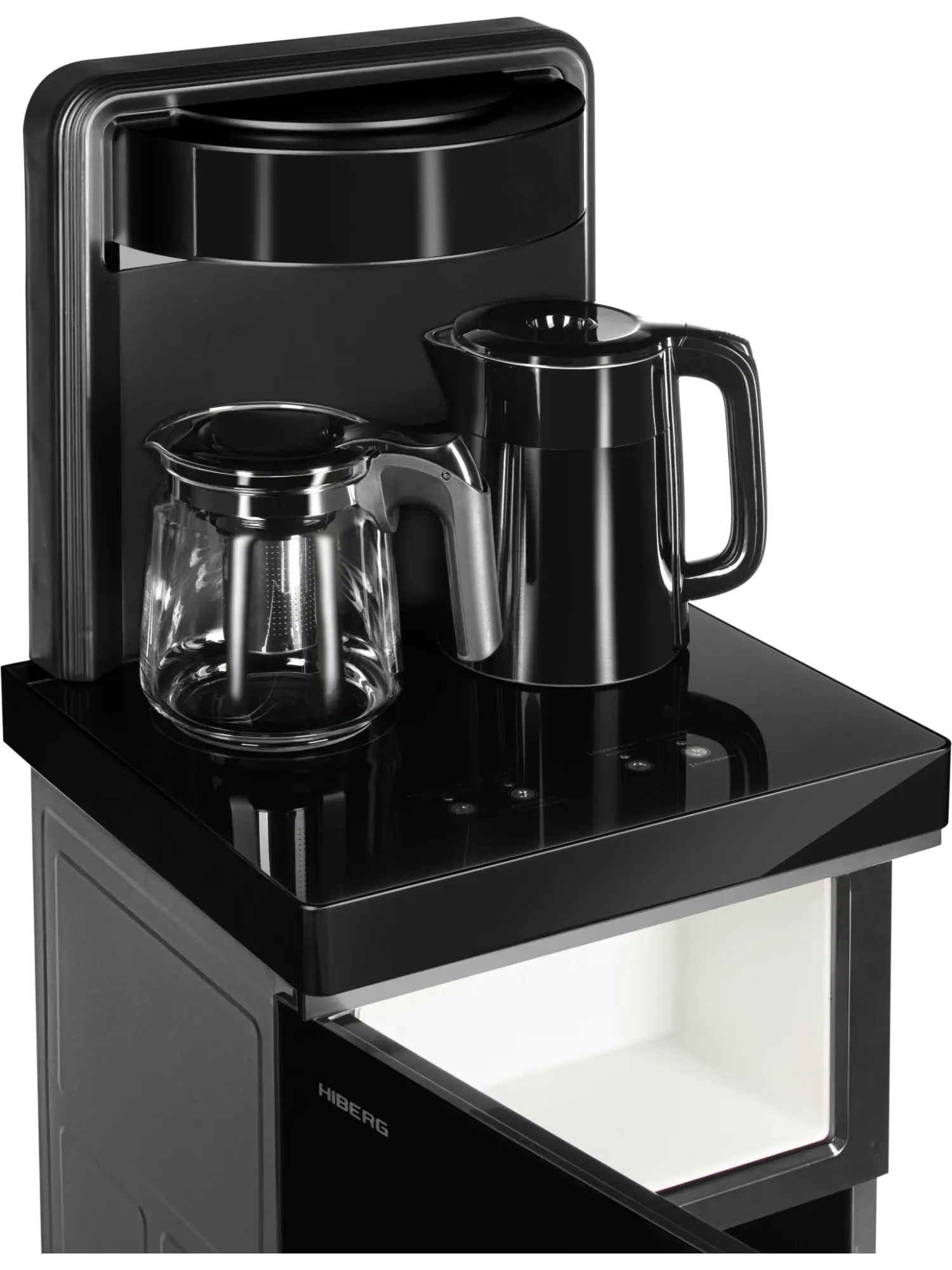 Под столешницей находится небольшой шкафчик объемом 7,5 л для хранения чайных принадлежностей и другой посуды. В нижней части кулера за дверцей расположен отсек для установки бутыли. Скрытая загрузка емкости сэкономит пространство и обеспечит оборудованию эстетичный вид в любом помещении. Кроме того, такое конструктивное решение исключает попадание прямых солнечных лучей в бутыль с водой, предотвращает образование вредных веществ и зацветания воды на дне бутыли. Кулер оснащен кранами для удобного наливания воды, а также столешницей с двумя чайниками — электрическим из нержавеющей стали и стеклянным заварочным. В кранах вода по умолчанию имеет комнатную температуру, но один из них можно легко переключить на охлаждение.