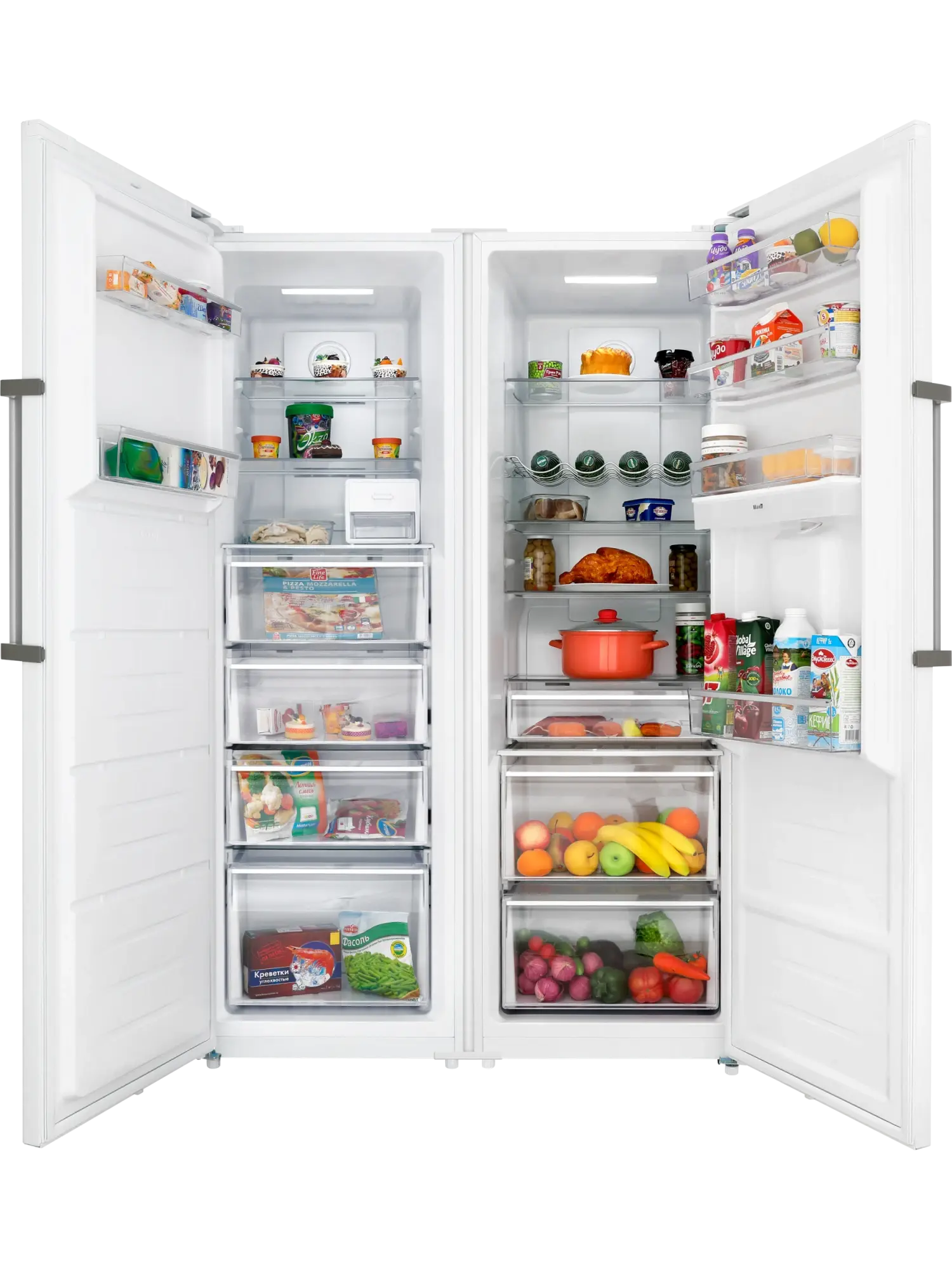 Комбинация белого цвета выполнена в современном лаконичном дизайне. Двери холодильной и морозильной камер перенавешиваются. Высота модели — 185 сантиметров.