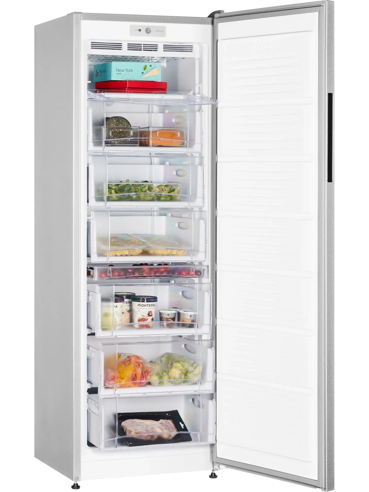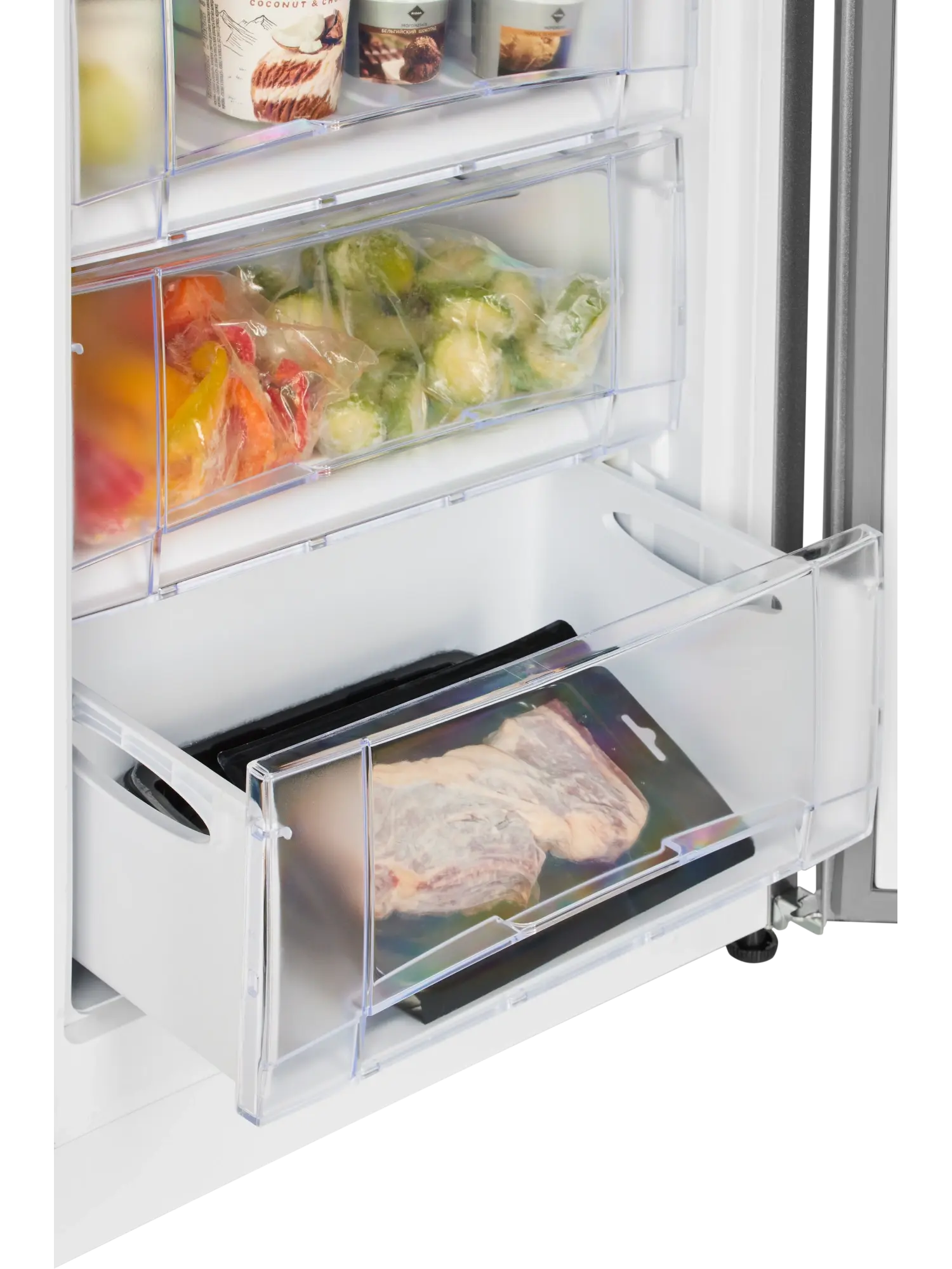 Морозильник серебристого цвета с черной интегрированной ручкой и продуманным внутренним пространством станет стильным и технологичным акцентом на вашей кухне. Высота устройства 173 см. Для комфортного открытия и установки морозильника в удобном месте — дверь можно перенавесить с правой стороны на левую.