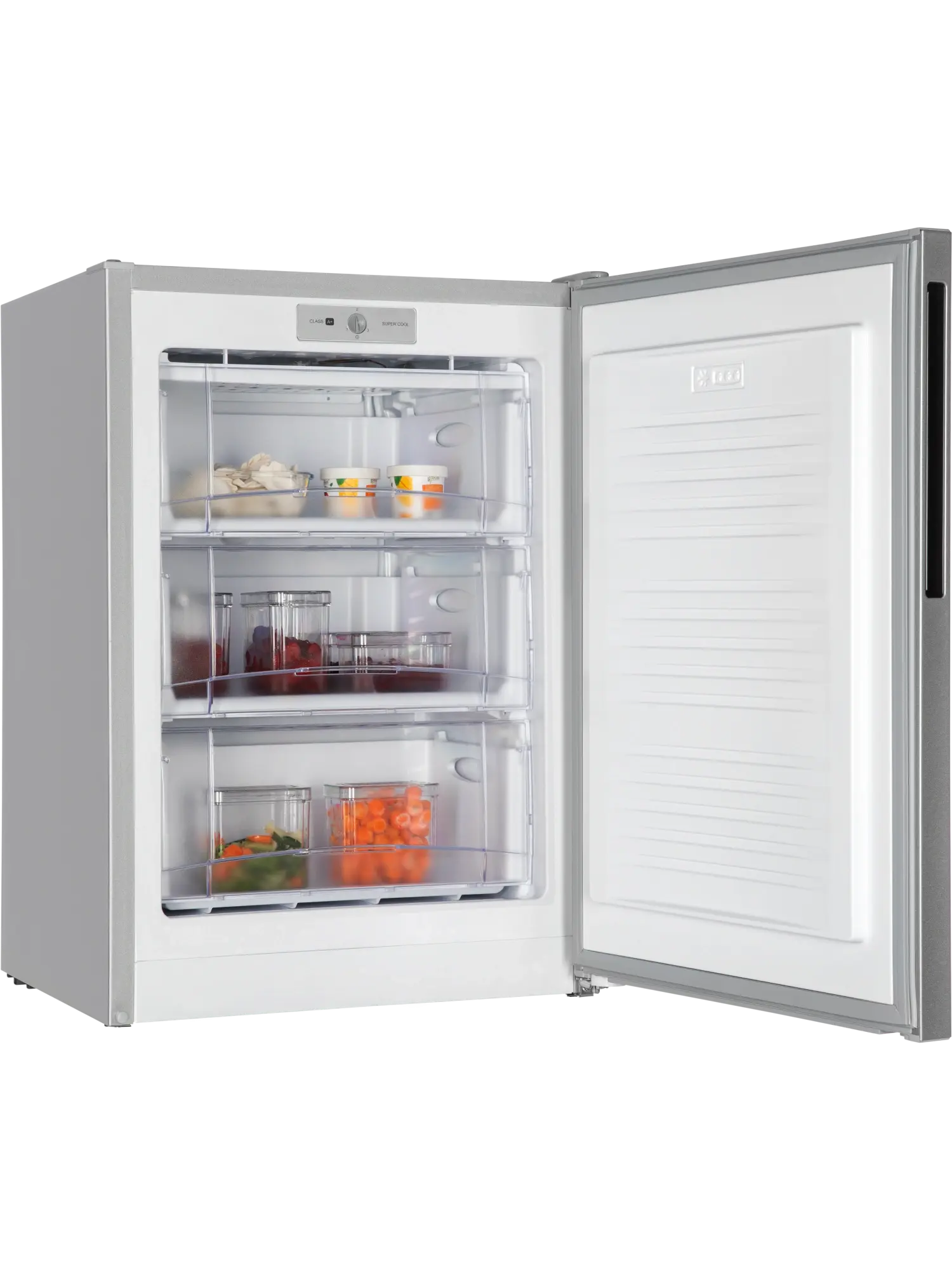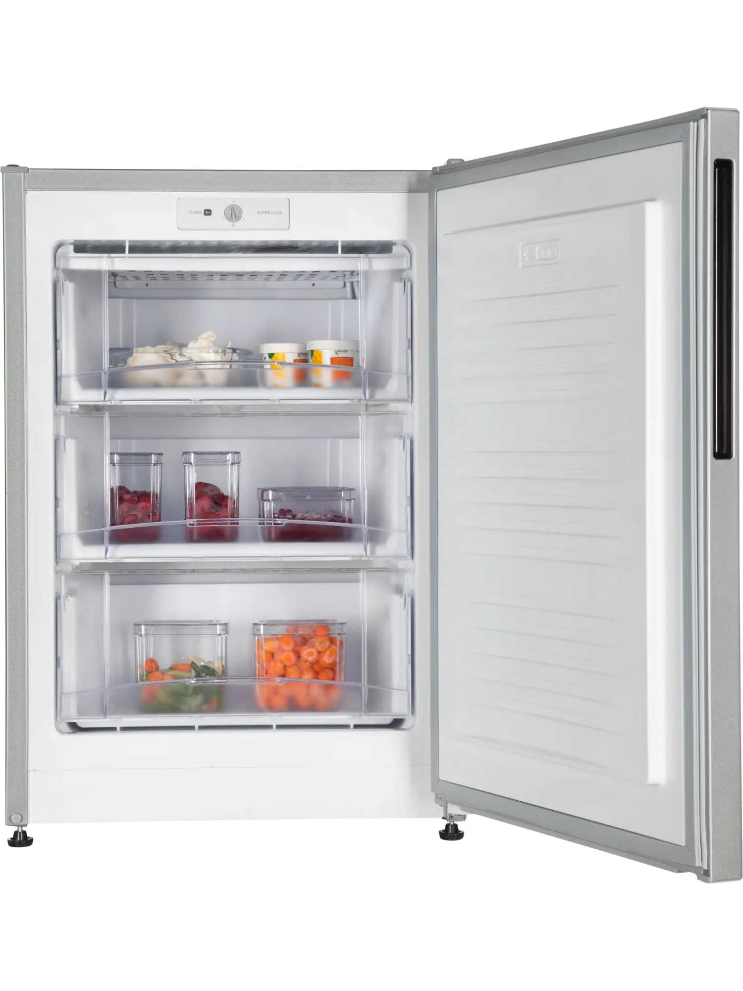 Морозильник серебристого цвета с черной интегрированной ручкой и продуманным внутренним пространством станет стильным и технологичным акцентом на вашей кухне. Высота устройства 85 см. Компактные размеры позволяют легко установить морозильник в малогабаритных квартирах или на даче. Для комфортного открытия и установки морозильника в удобном месте — дверь можно перенавесить с правой стороны на левую.