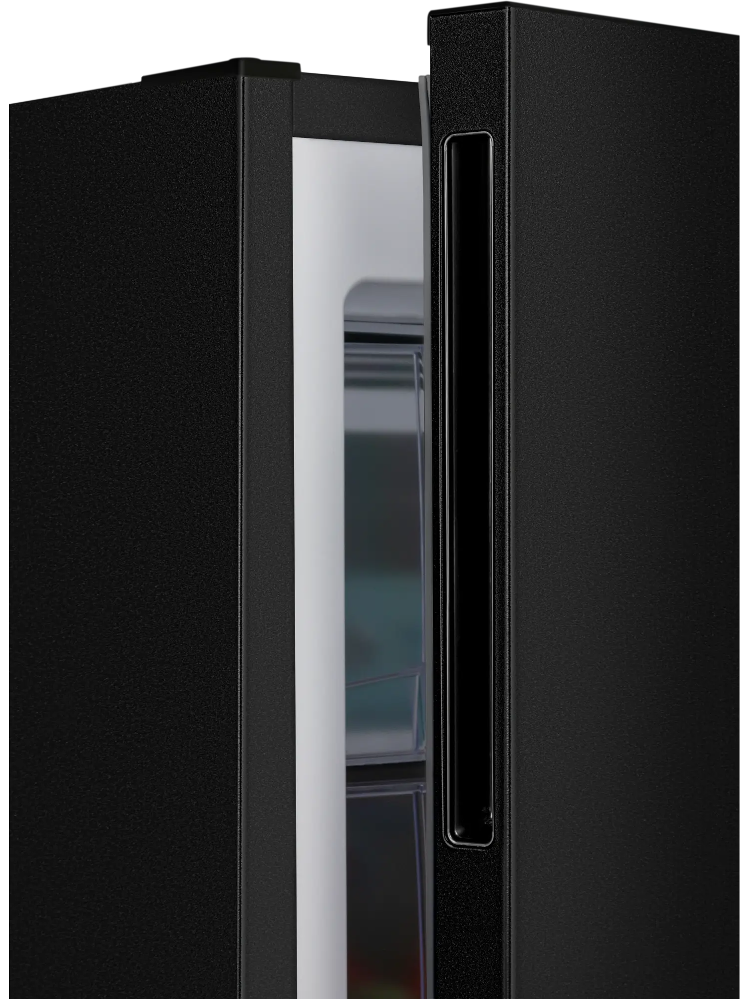 Морозильник черного матового цвета с черной интегрированной ручкой и продуманным внутренним пространством станет стильным и технологичным акцентом на вашей кухне. Высота устройства 109 см. Для комфортного открытия и установки морозильника в удобном месте — дверь можно перенавесить с правой стороны на левую.