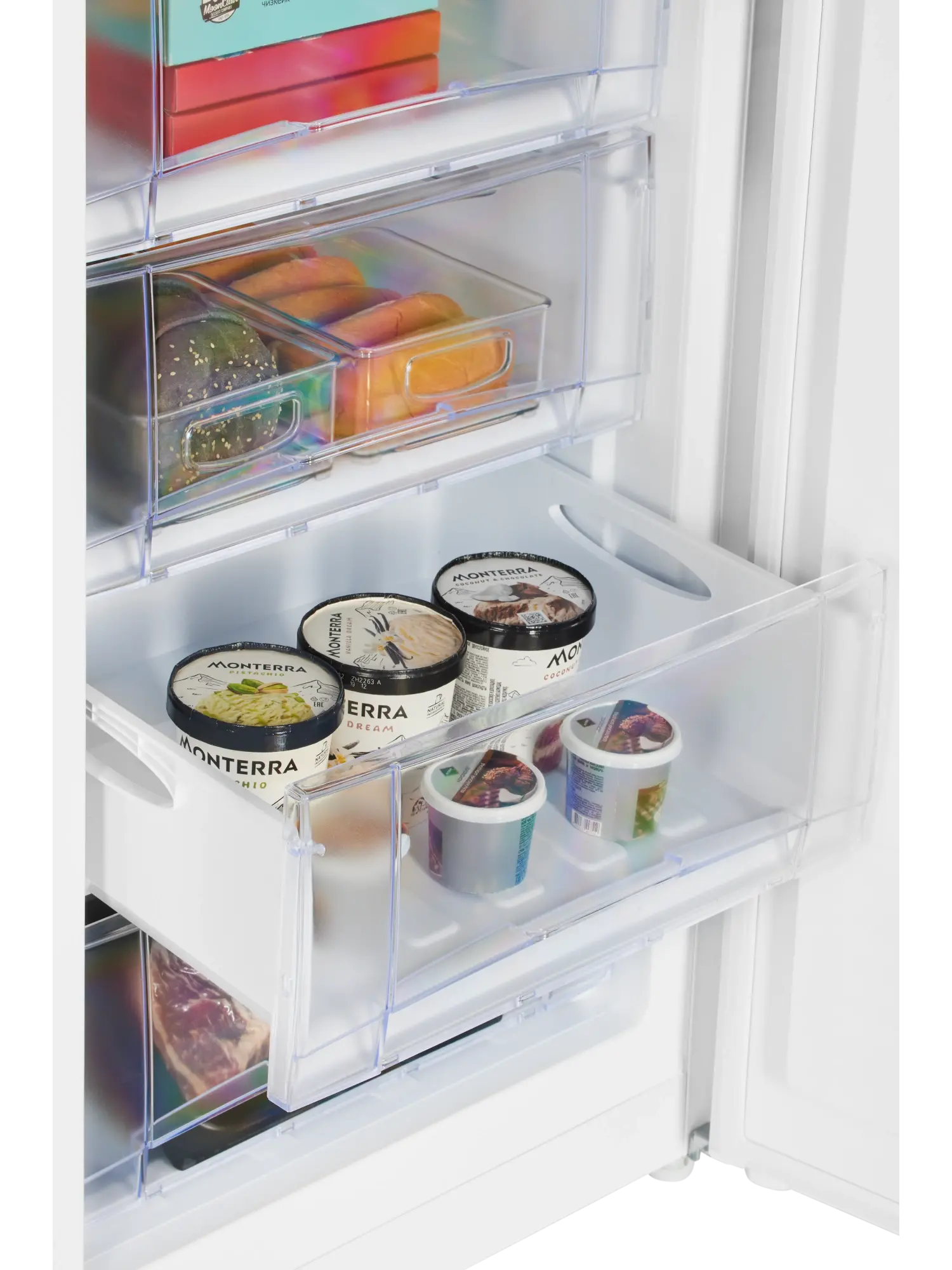Морозильник имеет 3 выдвижных прозрачных ящика для размещения продуктов, а также форму для льда. Внутренняя поверхность модели имеет антибактериальное покрытие, которое предотвращает появление неприятных запахов и образование бактерий.