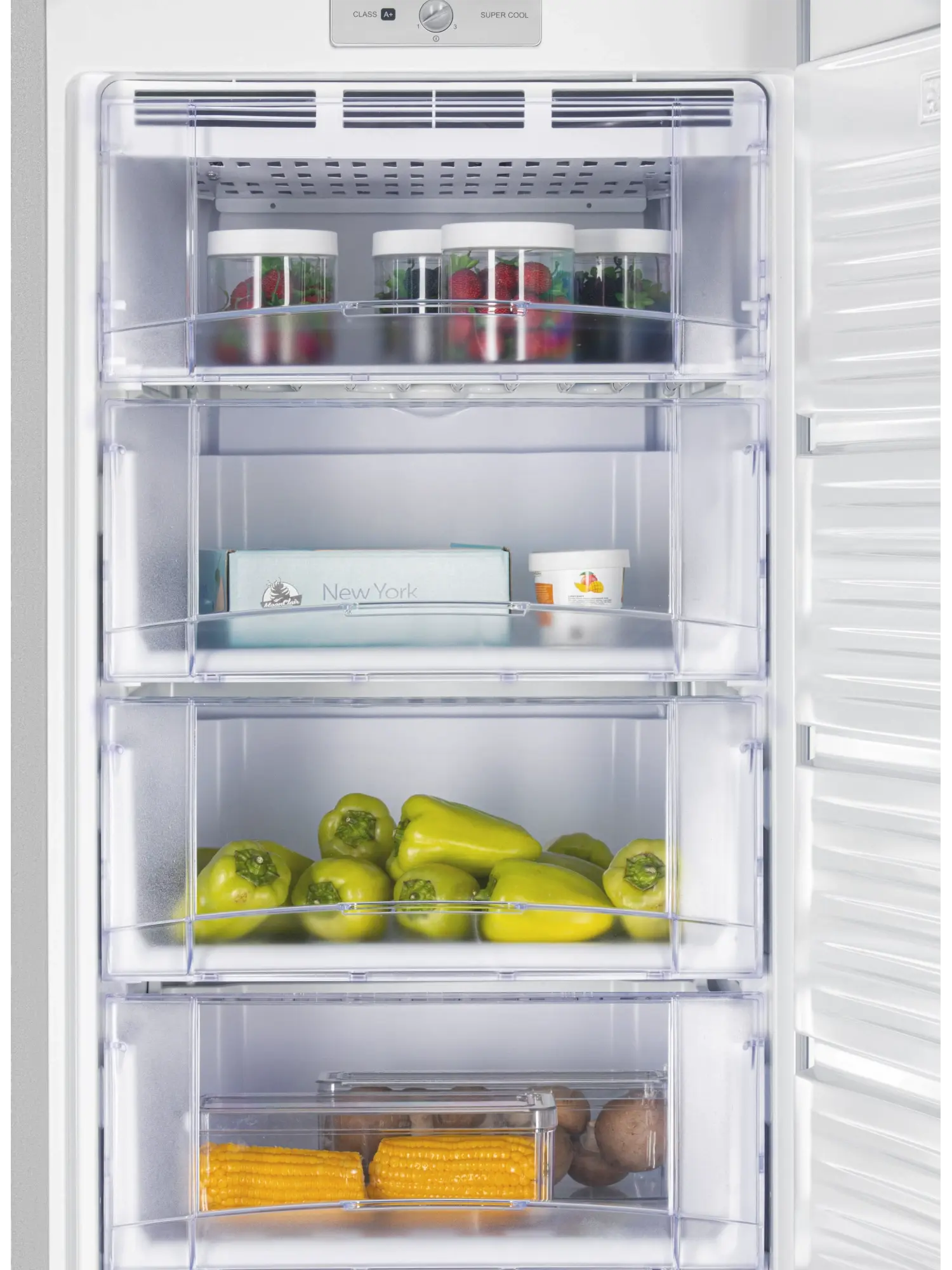 Морозильник серебристого цвета с черной интегрированной ручкой и продуманным внутренним пространством станет стильным и технологичным акцентом на вашей кухне. Высота устройства 147 см. Для комфортного открытия и установки морозильника в удобном месте — дверь можно перенавесить с правой стороны на левую.
