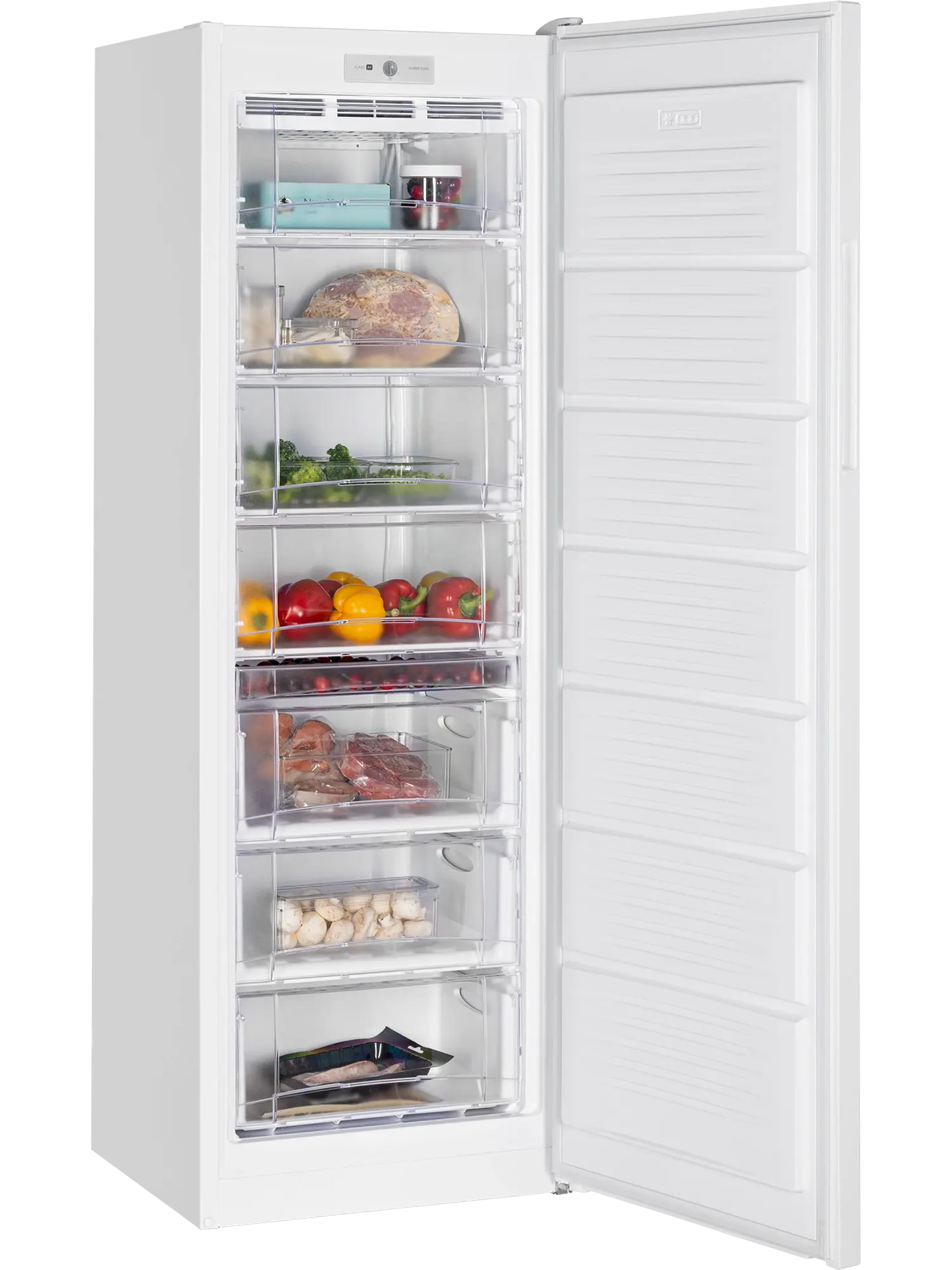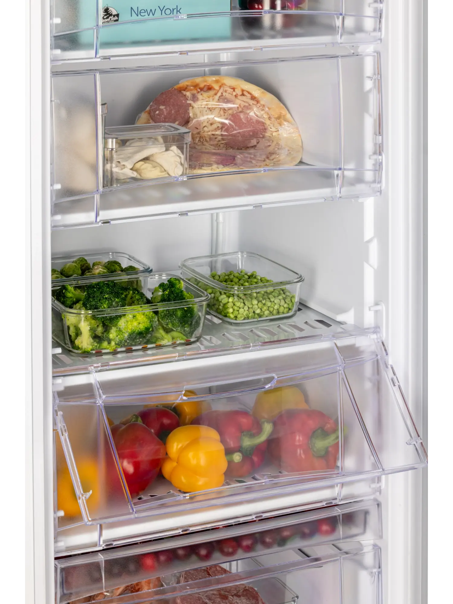 Nord NFR 173 W — вертикальный морозильник с вместительной камерой для глубокой заморозки и длительного хранения продуктов. Модель станет надежным помощником на кухне для хозяек, предпочитающих заготовки и увлеченных кулинарией. Морозильная камера объемом 256 л и высотой 173 см выполнена в белом цвете и дополнена интегрированной ручкой, что придает устройству стильный и завершенный вид. Перенавешиваемая дверь поможет адаптировать технику под конкретную планировку кухни. Модель относится к высокому классу энергоэффективности A+ и работает с уровнем шума до 39 дБ. Это позволяет экономить электроэнергию и при необходимости устанавливать морозильную камеру в жилых комнатах. Устройство замораживает до 16 кг продуктов в сутки. Этого достаточно для хранения мяса, рыбы, овощей, фруктов и ягод, а также полуфабрикатов. В случае отключения электричества морозильник сохраняет стабильную температуру до 7 часов. Система охлаждения морозильной камеры требует периодического ручного размораживания. Это обеспечивает стабильную работу и чистоту внутри. Организация вертикальной морозильной камеры максимально удобна: 3 прозрачных ящика — для замороженных продуктов длительного хранения; 4 отделения с откидной шторкой — для объемных упаковок и продуктов, к которым нужен быстрый доступ; лоток для заморозки ягод; форма для льда – для воды и кулинарных заготовок; поверхность вертикальной морозильной камеры с антибактериальным покрытием способствует чистоте внутри и свежести продуктов. Настройка температуры осуществляется с помощью механического термостата, расположенного внутри. Уровень «1» соответствует самой высокой температуре, а «3» поддерживает минимально возможную температуру –18°C. Гарантия на морозильники Nord — 2 года.