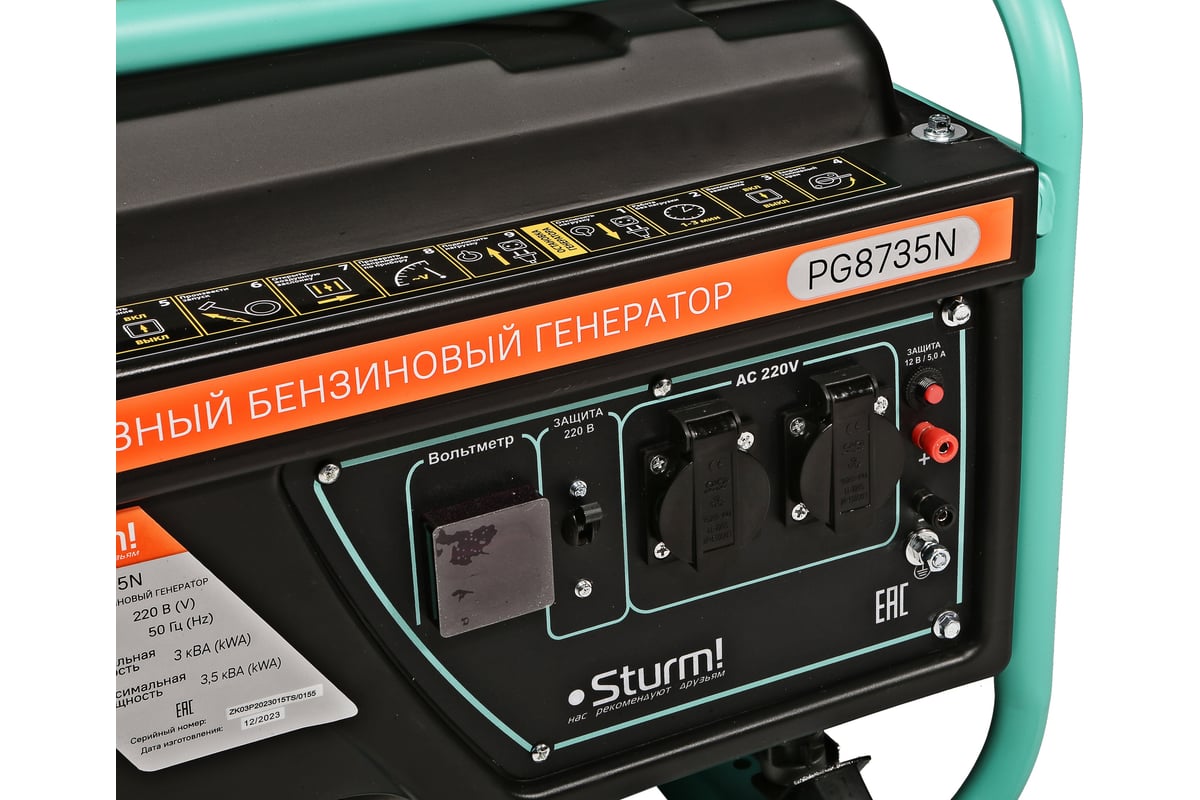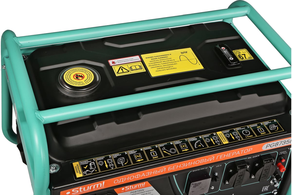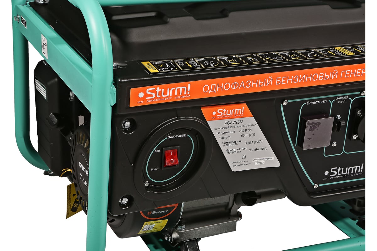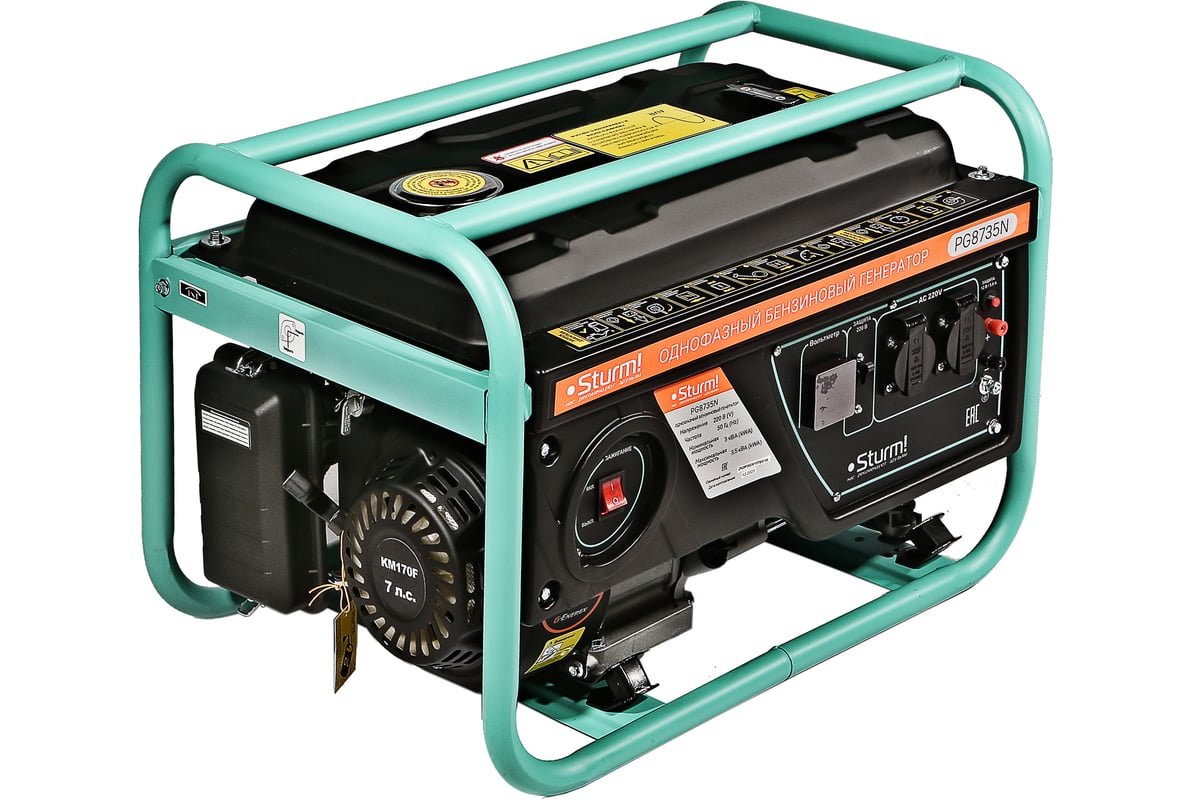 Бензогенератор Sturm PG8735N 3500 ВА, AVR (Авто. Рег.Напр.), ручн старт, 42 кг, бак 15л PG8735N представляет собой мобильное оборудование, которое легко перемещать по строительной площадке и мастерской либо хранить в подвале или гараже частного дома. Модель обеспечивает чистый ток без помех.
