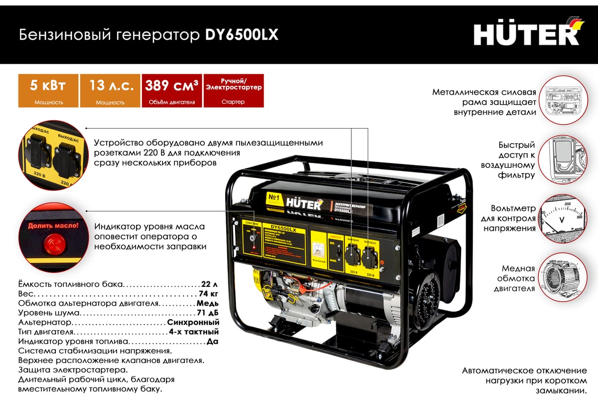 * На электрогенераторы Huter DY6500LX возможна установка дополнительного оборудования – автоматической системы ввода резерва (АВР). Данная система автоматически запускает генератор при отсутствии электроэнергии в сети и автоматически отключает генератор, когда электричество в сети появляется.