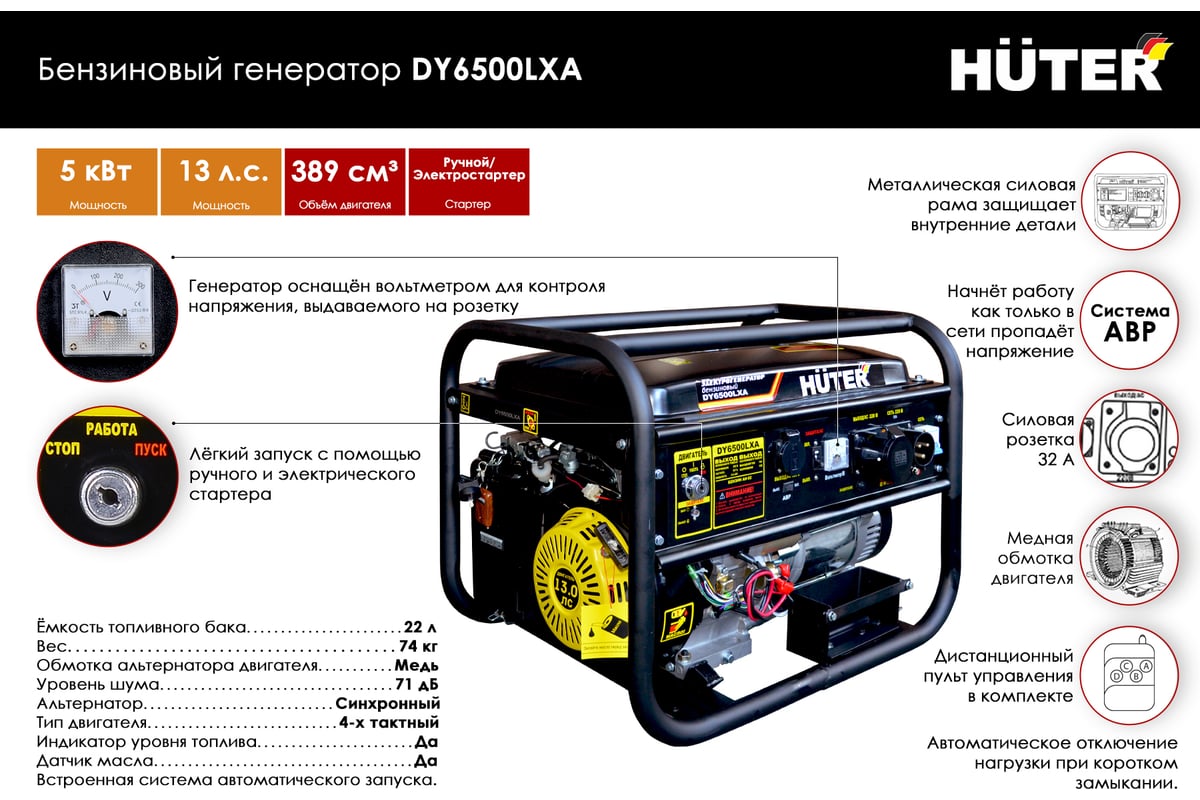 Модель генератора HUTER DY6500LXA во всем аналогична DY6500LX и отличается только наличием автоматического ввода резерва (АВР). Его можно дополнительно установить и на DY6500LX.