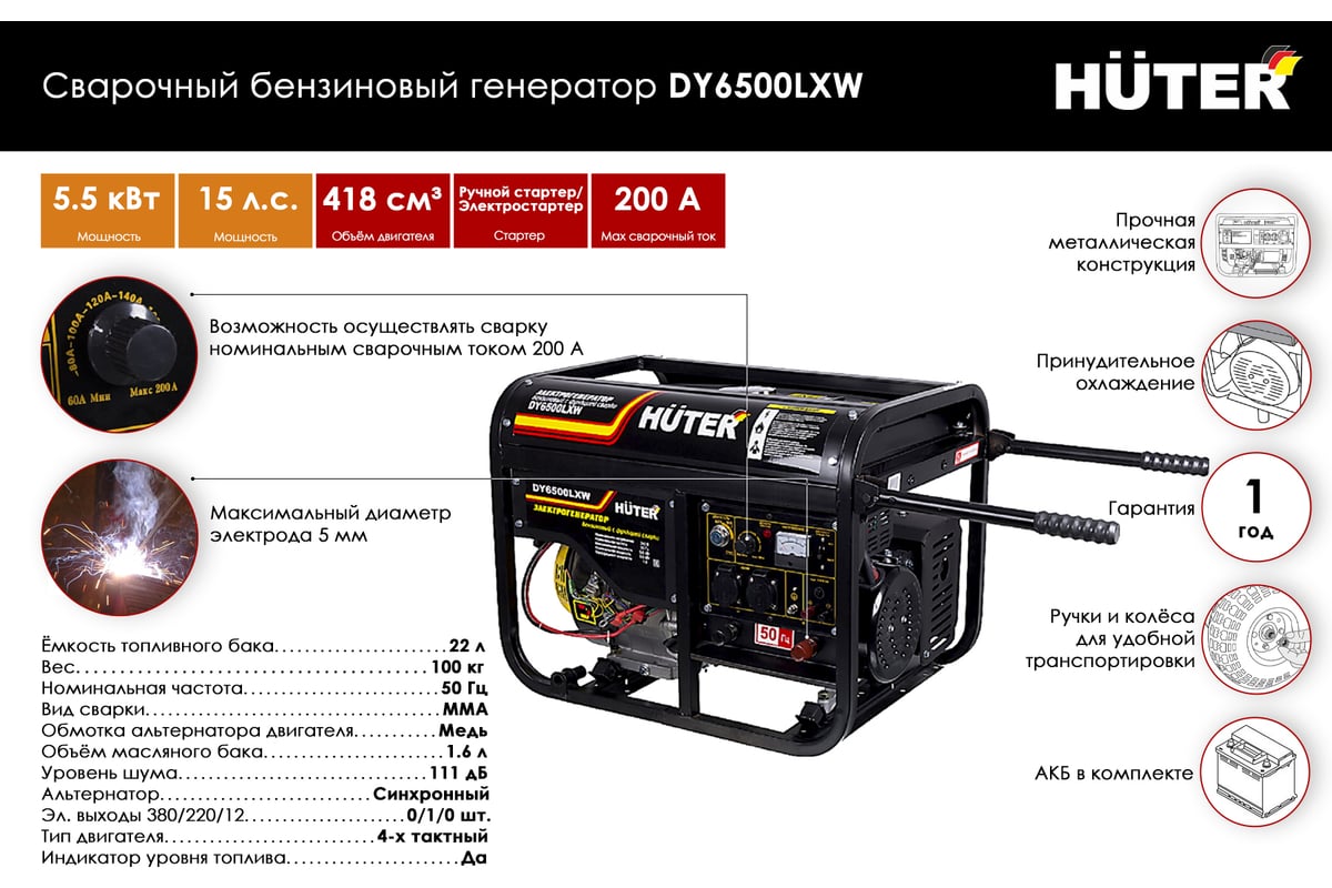 Сварочный бензиновый генератор Huter DY6500LXW предназначен для питания электроприборов общей мощностью до 5 кВт. Данная модель используется как автономный источник электроэнергии. Благодаря малогабаритности генератор применяется как при строительно-ремонтных работах, так и в быту.