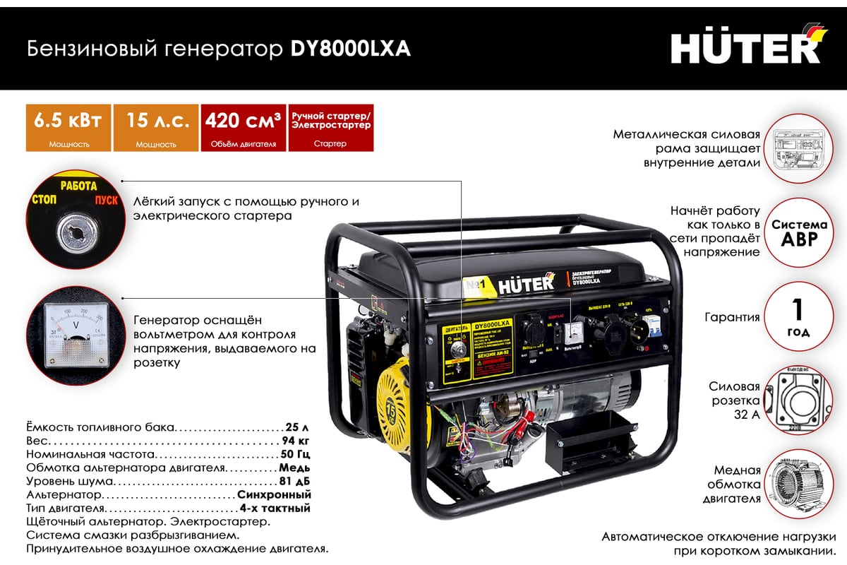 На электрогенераторы Huter DY8000LXA возможна установка дополнительного оборудования – автоматической системы ввода резерва (АВР). Данная система автоматически запускает генератор при отсутствии электроэнергии в сети и автоматически отключает генератор, когда электричество в сети появляется.