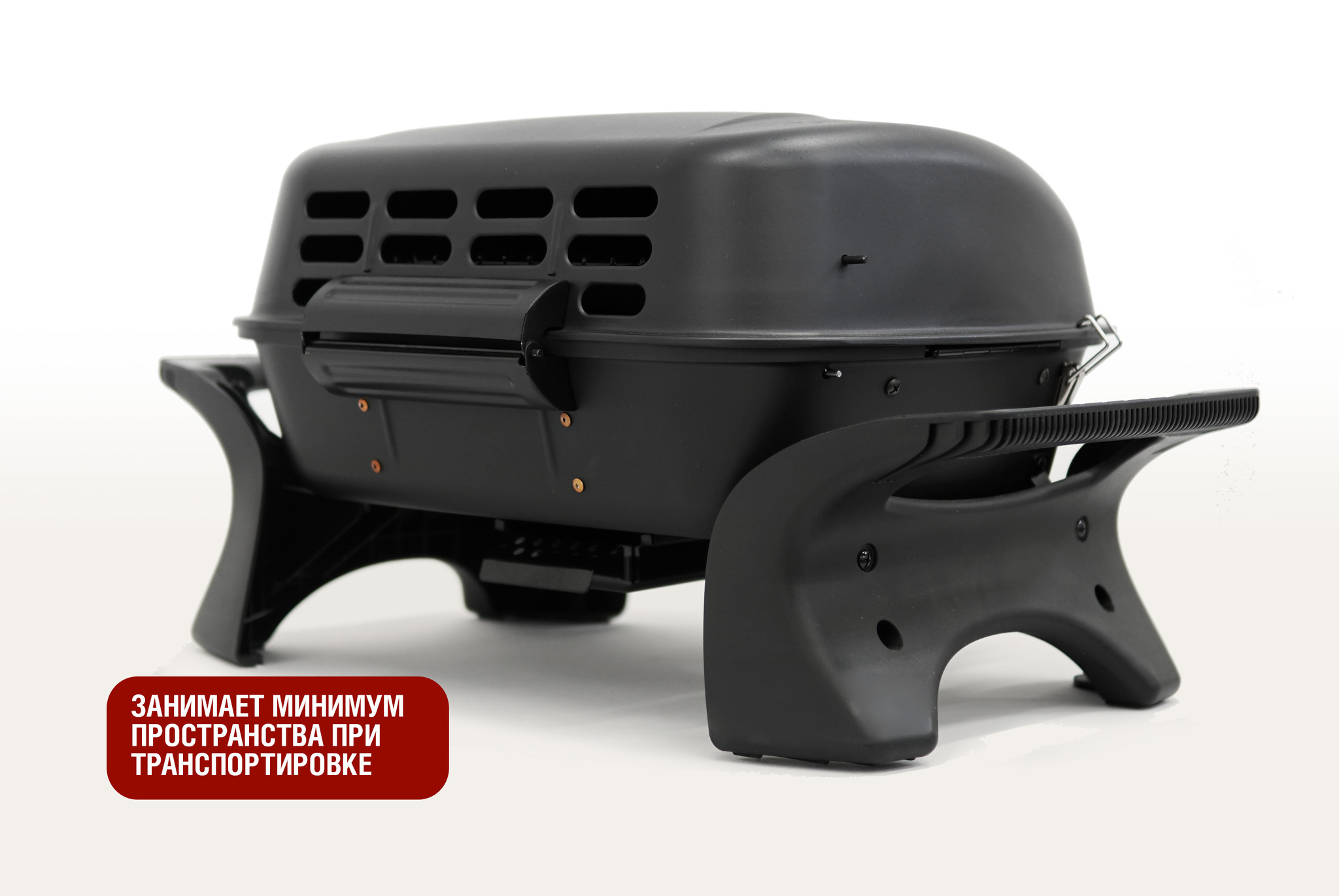 Несмотря на свою мобильность и компактность в сложенном виде, гриль имеет внушительные размеры зоны приготовления 47 на 37 см. Крышка гриля имеет фиксаторы в закрытом состоянии для надежности перемещения и хранения.