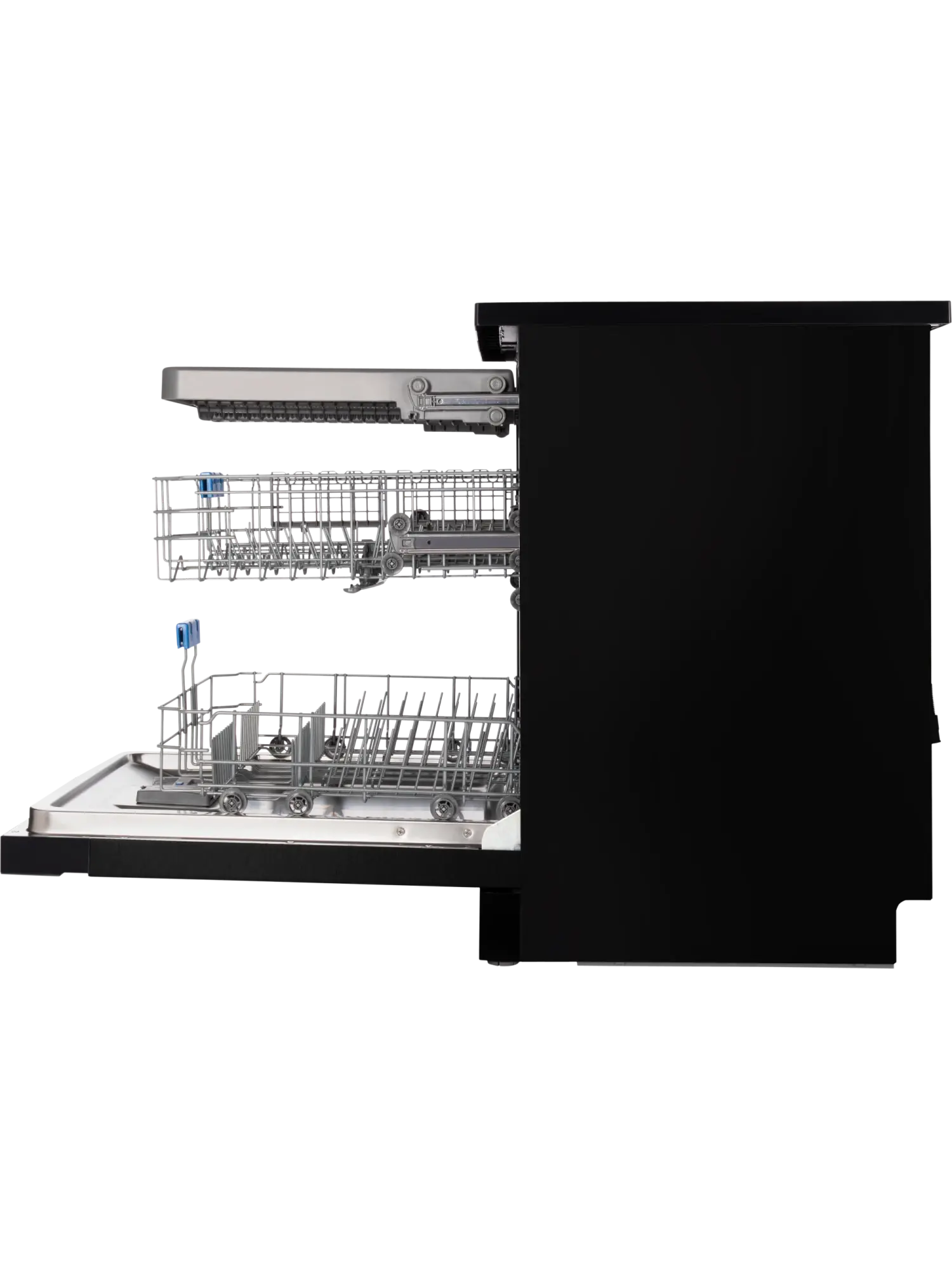 Положение средней корзины для посуды можно регулировать по высоте для удобного размещения больших кастрюль и сковород в нижней корзине.