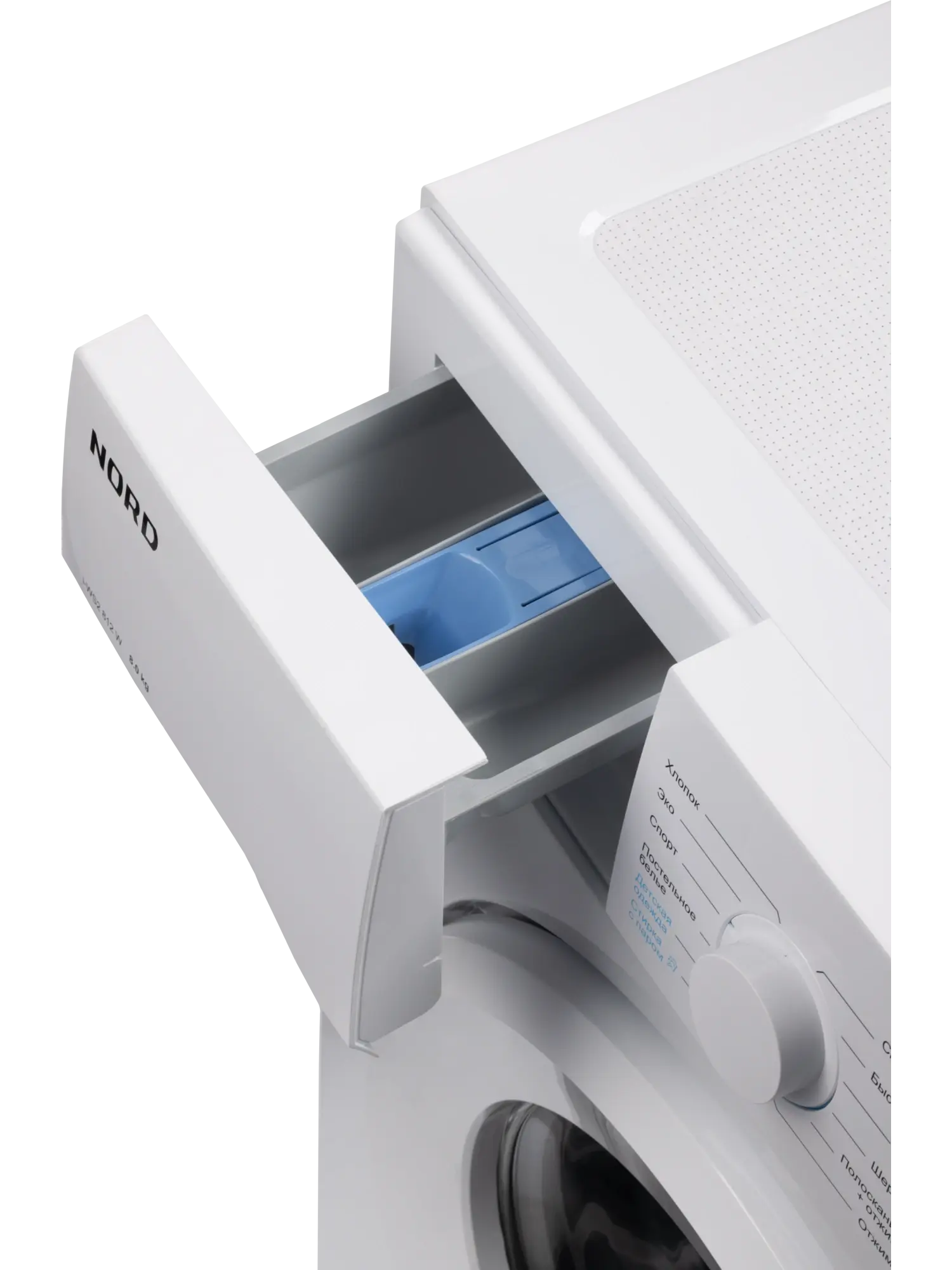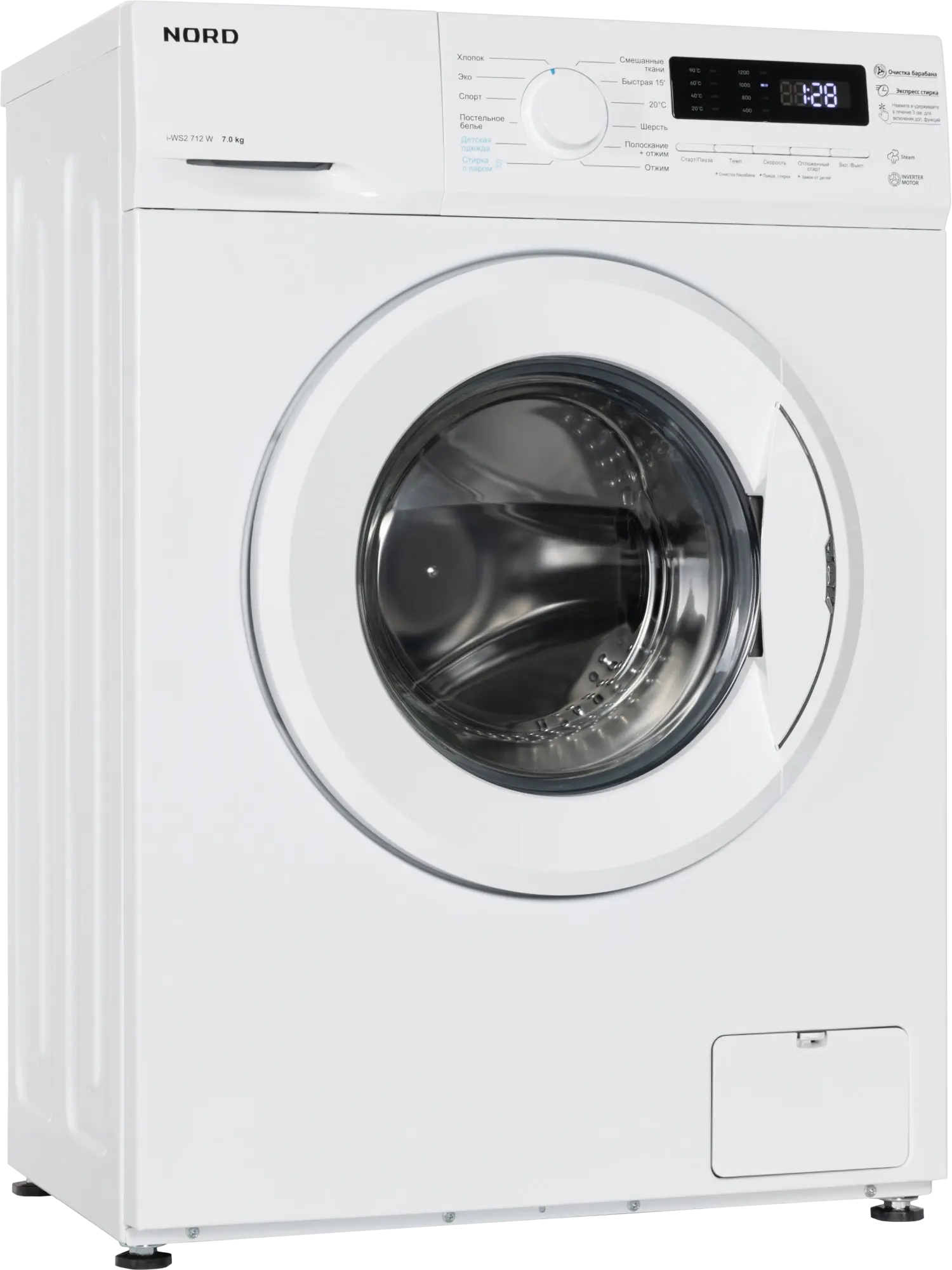 Стиральная машина Nord i-WS2 712 W — компактная, тихая и экономичная модель с инверторным мотором и функцией стирки с паром. Рассчитана на 7 кг белья, скорость отжима достигает 1200 об/мин, класс энергоэффективности — A+++. Управление: механический диск и кнопки с LED-дисплеем для выбора программы, температуры и дополнительных функций. Программы (12): Хлопок, Эко, Спорт, Постельное бельё, Детская одежда, Стирка с паром, Смешанные ткани, 20 °C, Быстрая стирка 15 мин, Шерсть, Отжим, Полоскание + отжим. Особенности: – Интеллектуальная программа Smart — автоматическое определение веса, времени и температуры стирки; – Стирка с паром — устраняет запахи, бактерии и аллергены, сохраняет структуру ткани; – Автовзвешивание для оптимального расхода воды; – Отсрочка старта до 24 ч; – Предварительная стирка, очистка барабана; – Блокировка от детей, контроль пенообразования и автобалансировка. Конструкция: – Барабан из нержавеющей стали с волновым подъёмником для бережной и эффективной стирки; – Компактная глубина — 44 см, подходит для небольших помещений; – Цвет — белый. Характеристики: – загрузка — 7 кг; – отжим — 1200 об/мин; – энергоэффективность — A+++; – 12 программ; – глубина — 44 см; – гарантия — 2 года. Nord i-WS2 712 W — узкая, экономичная и функциональная стиральная машина с паровой стиркой и интеллектуальным управлением.