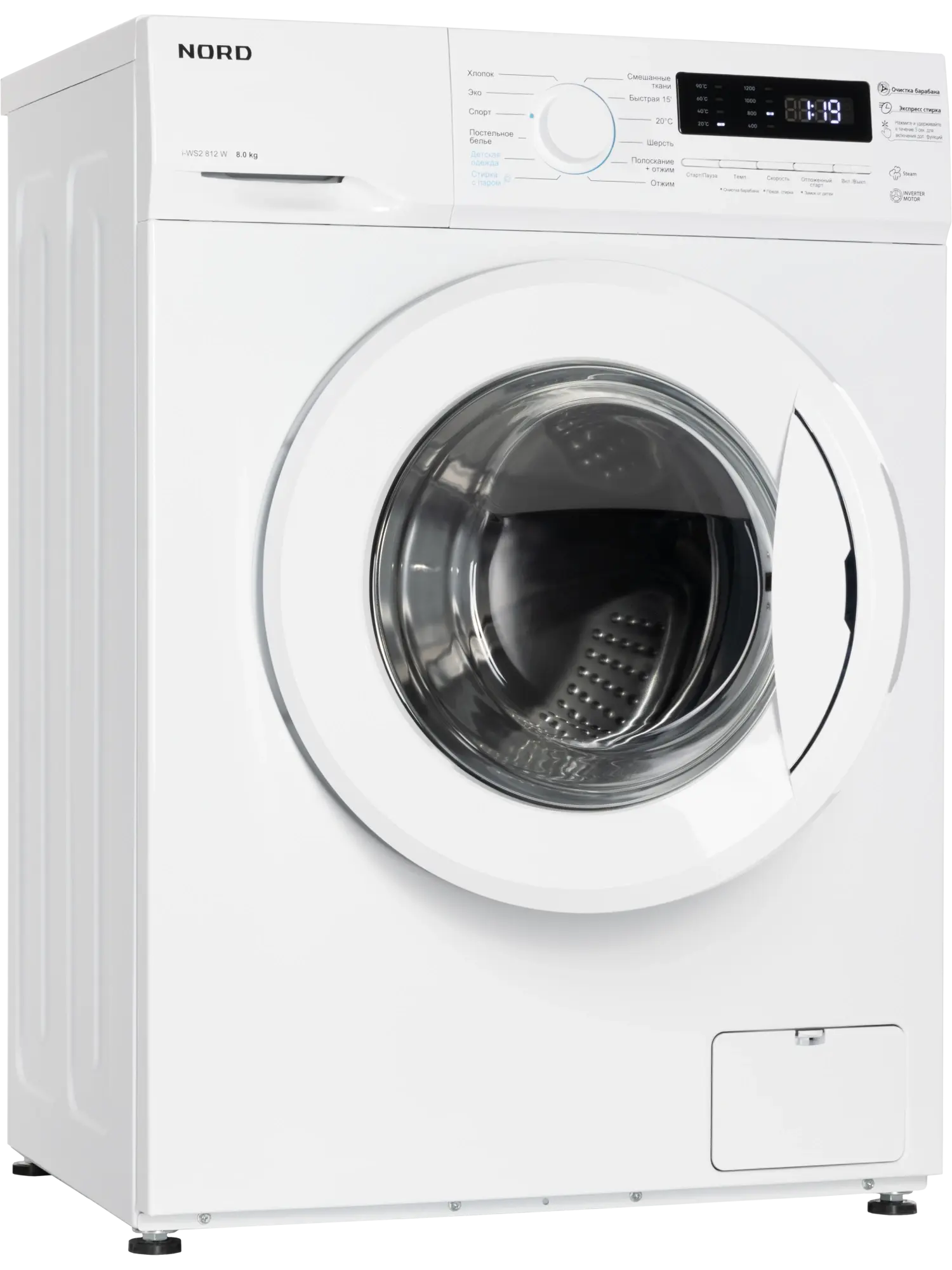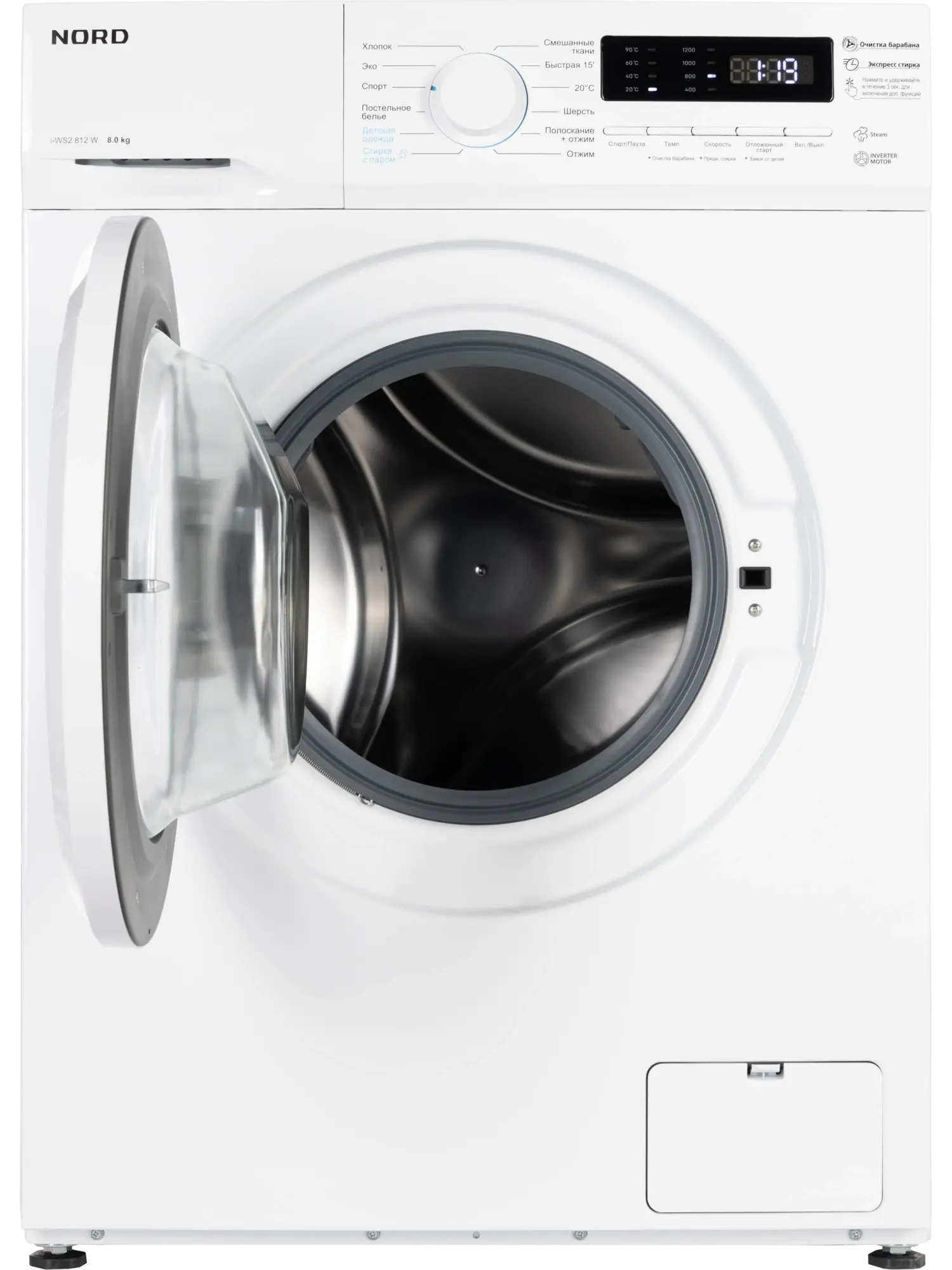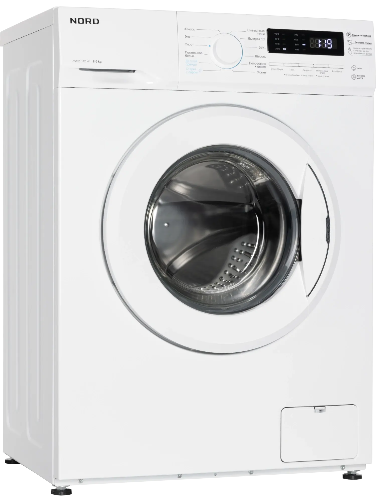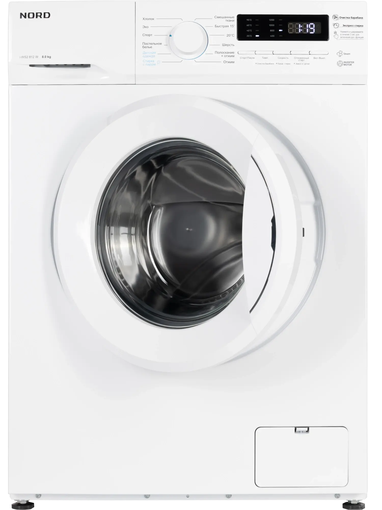 Стиральная машина Nord i-WS2 812 W — современная инверторная модель с функцией стирки с паром, обеспечивающая высокое качество и бережный уход за бельем. Рассчитана на 8 кг загрузки, развивает скорость отжима до 1200 об/мин, имеет класс энергоэффективности A+++ и отличается тихой, экономичной работой. Управление: механический диск и кнопки с LED-дисплеем для выбора режима, температуры и дополнительных функций. Программы (12): Хлопок, Эко, Спорт, Постельное бельё, Детская одежда, Стирка с паром, Смешанные ткани, 20 °C, Быстрая стирка 15 мин, Шерсть, Отжим, Полоскание + отжим. Особенности: – Интеллектуальная программа Smart — автоматический выбор параметров стирки; – Стирка с паром — удаляет запахи, бактерии и аллергены, сохраняя структуру ткани; – Автовзвешивание для оптимального расхода воды; – Отсрочка старта, предварительная стирка, очистка барабана; – Блокировка от детей, контроль пенообразования, автобалансировка. Конструкция: – Барабан из нержавеющей стали с волновым подъёмником для мягкой и эффективной стирки; – Компактная глубина — 48 см, подходит для небольших помещений; – Цвет — белый. Характеристики: – загрузка — 8 кг; – отжим — 1200 об/мин; – энергоэффективность — A+++; – 12 программ; – глубина — 48 см; – гарантия — 2 года. Nord i-WS2 812 W — тихая, компактная и функциональная стиральная машина с умной стиркой и бережным паровым уходом.