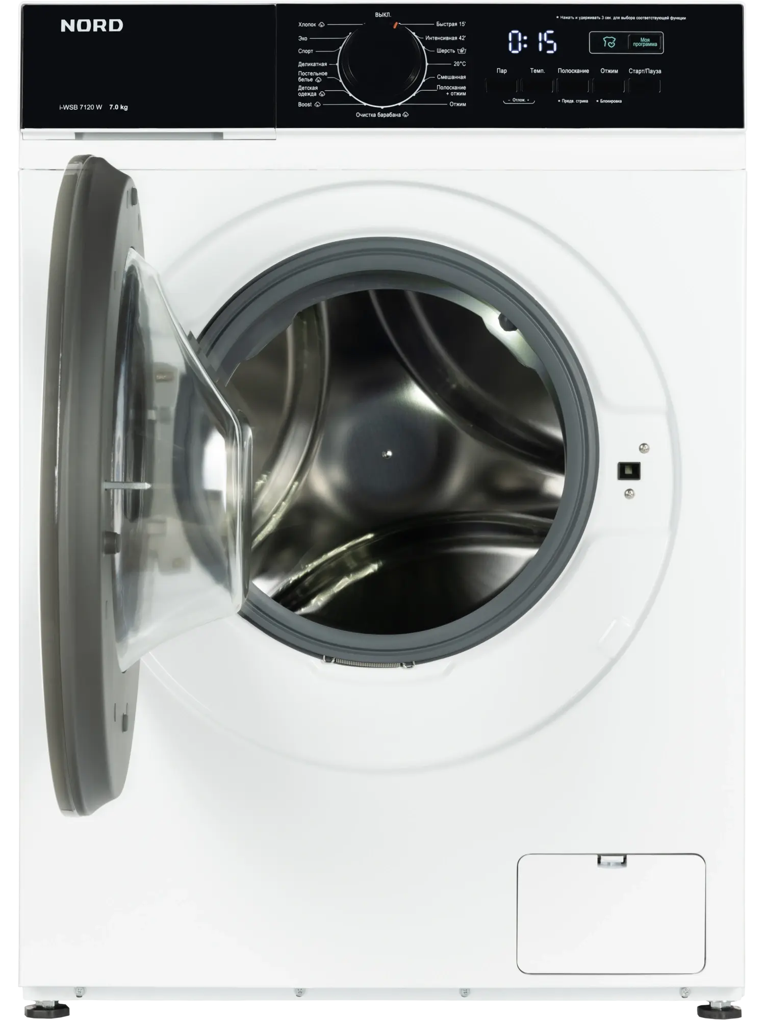 Стиральная машина Nord i-WSB 7120 W — современная узкая модель глубиной всего 44 см с загрузкой до 7 кг, идеально подходящая для небольших помещений. Она сочетает компактность, энергоэффективность и широкий функционал для бережной и качественной стирки. Интеллектуальная система Smart автоматически определяет вес белья и подбирает оптимальные параметры — температуру, количество воды и время цикла. Машина контролирует баланс барабана и уровень пены, обеспечивая стабильную и тихую работу. Волновой подъёмник барабана обеспечивает мягкое перемещение ткани и деликатную стирку без износа. Обработка паром глубоко очищает волокна, устраняет запахи, бактерии и аллергены, разглаживает складки и делает одежду более свежей — идеально для детских вещей и постельного белья. Инверторный двигатель (BLDC) гарантирует надёжность, долговечность и низкий уровень шума, а класс энергоэффективности A+++ подтверждает экономичность работы. Программы и функции 15 программ: Хлопок, ЭКО, Спорт, Деликатная, Постельное бельё, Детская, BOOST, Быстрая 15’, Интенсивная 42’, Шерсть, 20°C, Смешанная, Полоскание + отжим, Отжим, Очистка барабана; Регулировка температуры (от холодной до 90°C) и отжима (до 1200 об/мин); Предварительная стирка, дополнительное полоскание, отложенный старт (3–24 ч); Блокировка от детей; Функция «Моя программа» — сохранение индивидуальных настроек для быстрого запуска. Дополнительные удобства Люк диаметром 300 мм, угол открытия 150°; Подключение к горячей и холодной воде; LED-дисплей с отображением этапов стирки и оставшегося времени. Характеристики Загрузка: 7 кг Глубина: 44 см Отжим: до 1200 об/мин Энергоэффективность: A+++ Стирка с паром, Smart-управление Цвет: белый Гарантия — 2 года Nord i-WSB 7120 W — тихая, компактная и функциональная стиральная машина с интеллектуальными технологиями и паровой стиркой для безупречной чистоты и свежести каждый день.