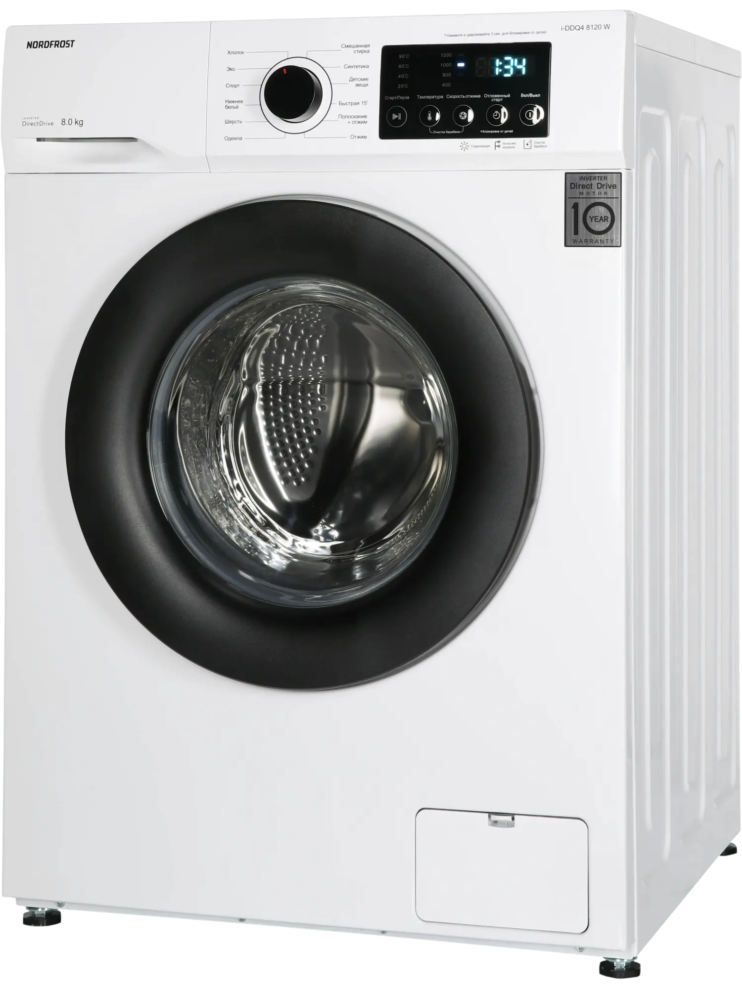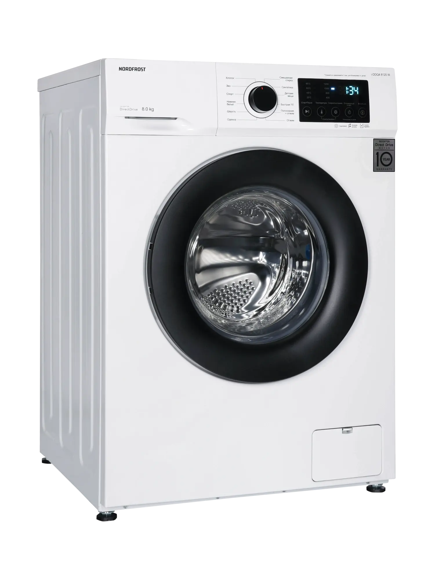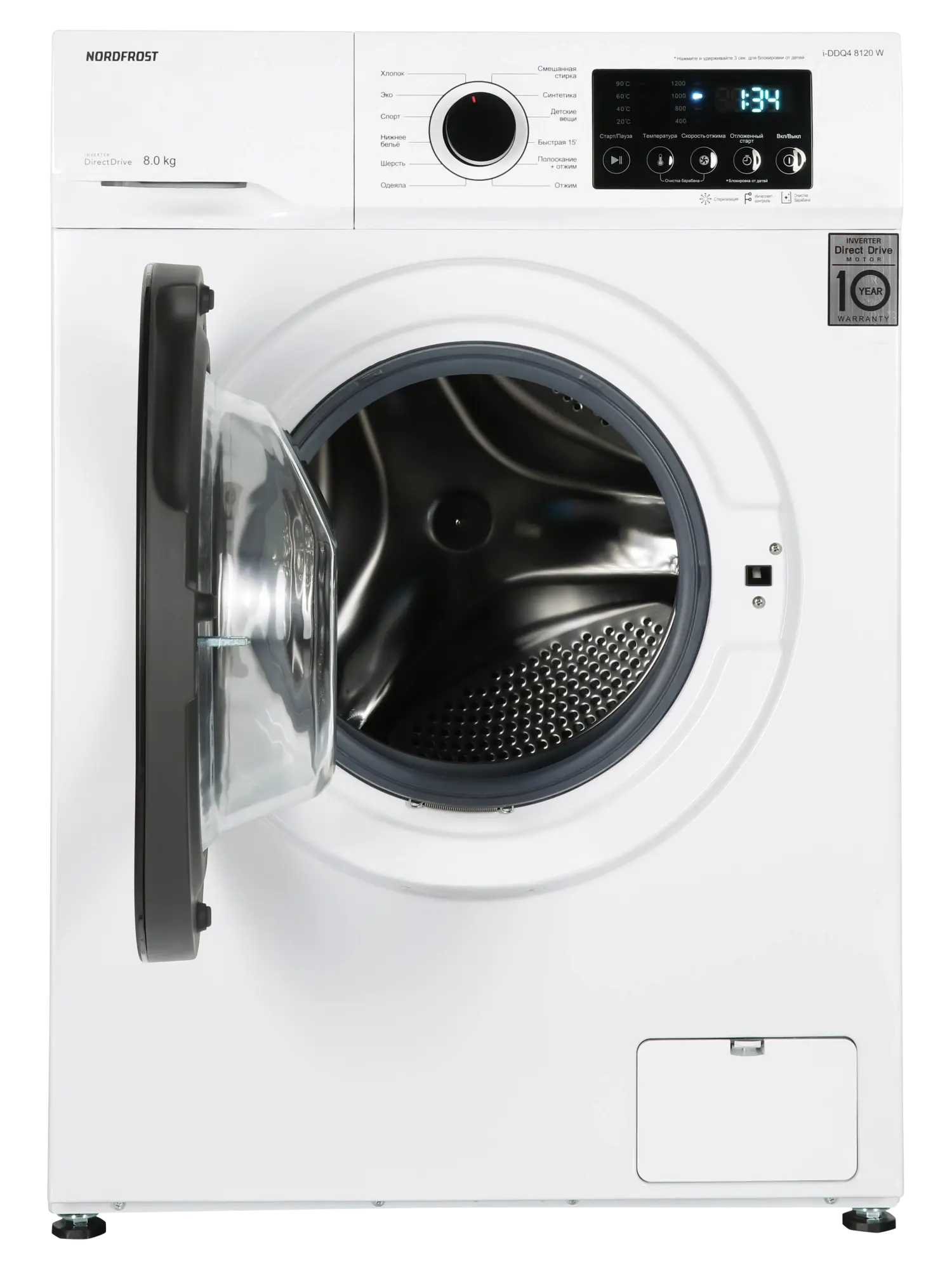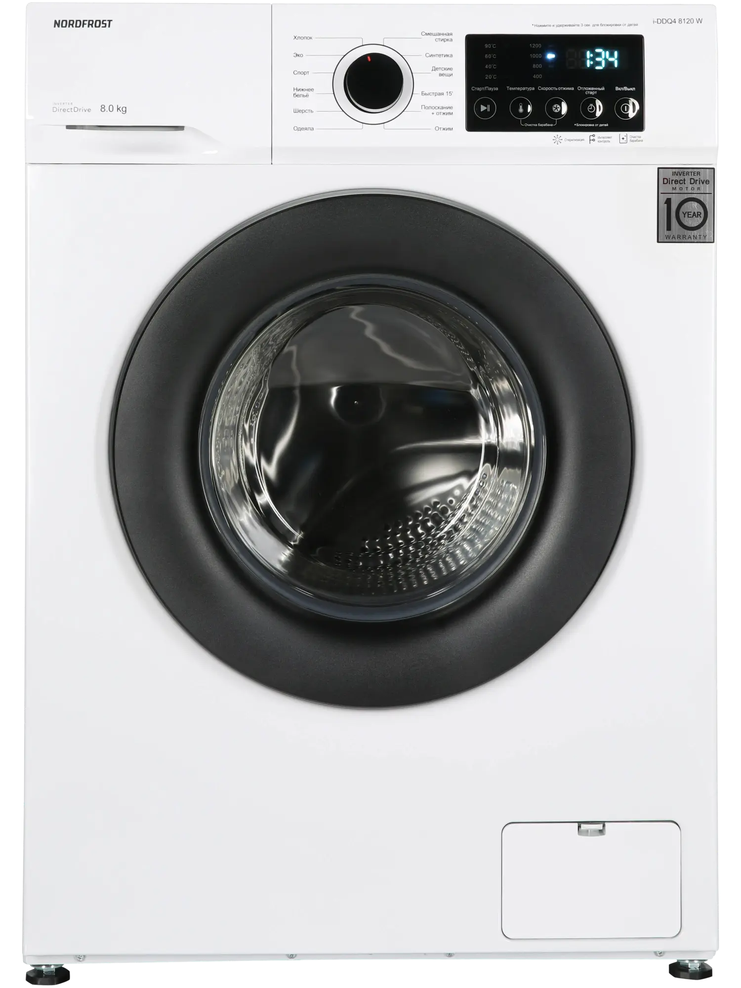 Отдельностоящая стиральная машина Nord i-DDQ4 8120 W с инверторным мотором и системой прямого привода имеет прекрасный показатель загрузки белья до 8 кг.