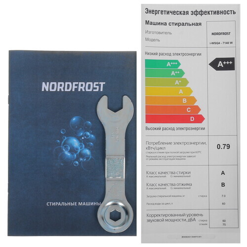 Высший класс энергоэффективности А+++ характеризуется низким потреблением воды и электричества. Машинка потребляет до 60 л воды за цикл стирки с максимальной скоростью отжима 1400 оборотов в минуту.