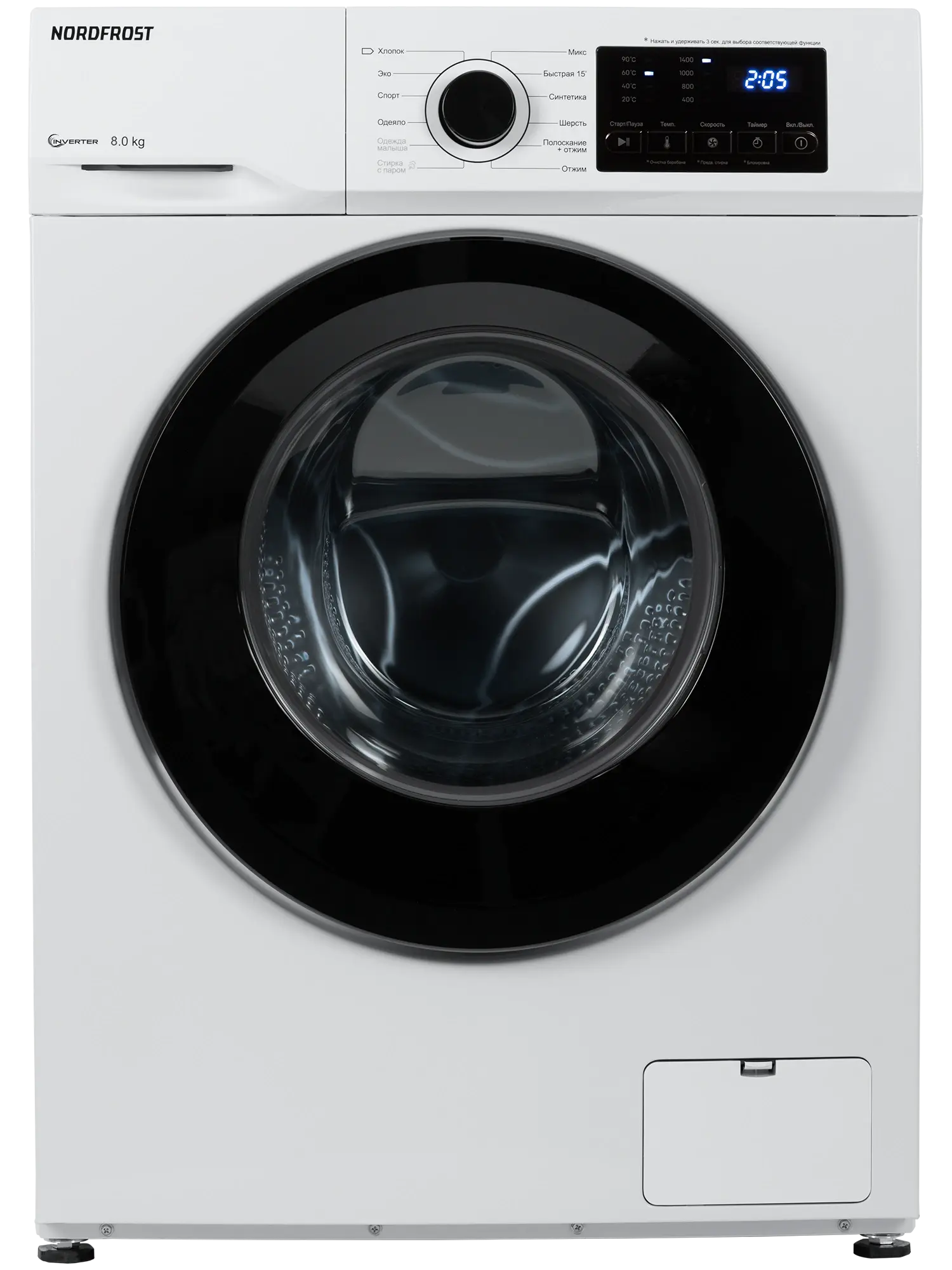 С помощью механического диска на панели управления можно выбрать необходимую программу с предустановленными настройками, а кнопками отрегулировать температуру и скорость отжима. На LED-дисплее световой индикацией отражается вся информация по режиму.