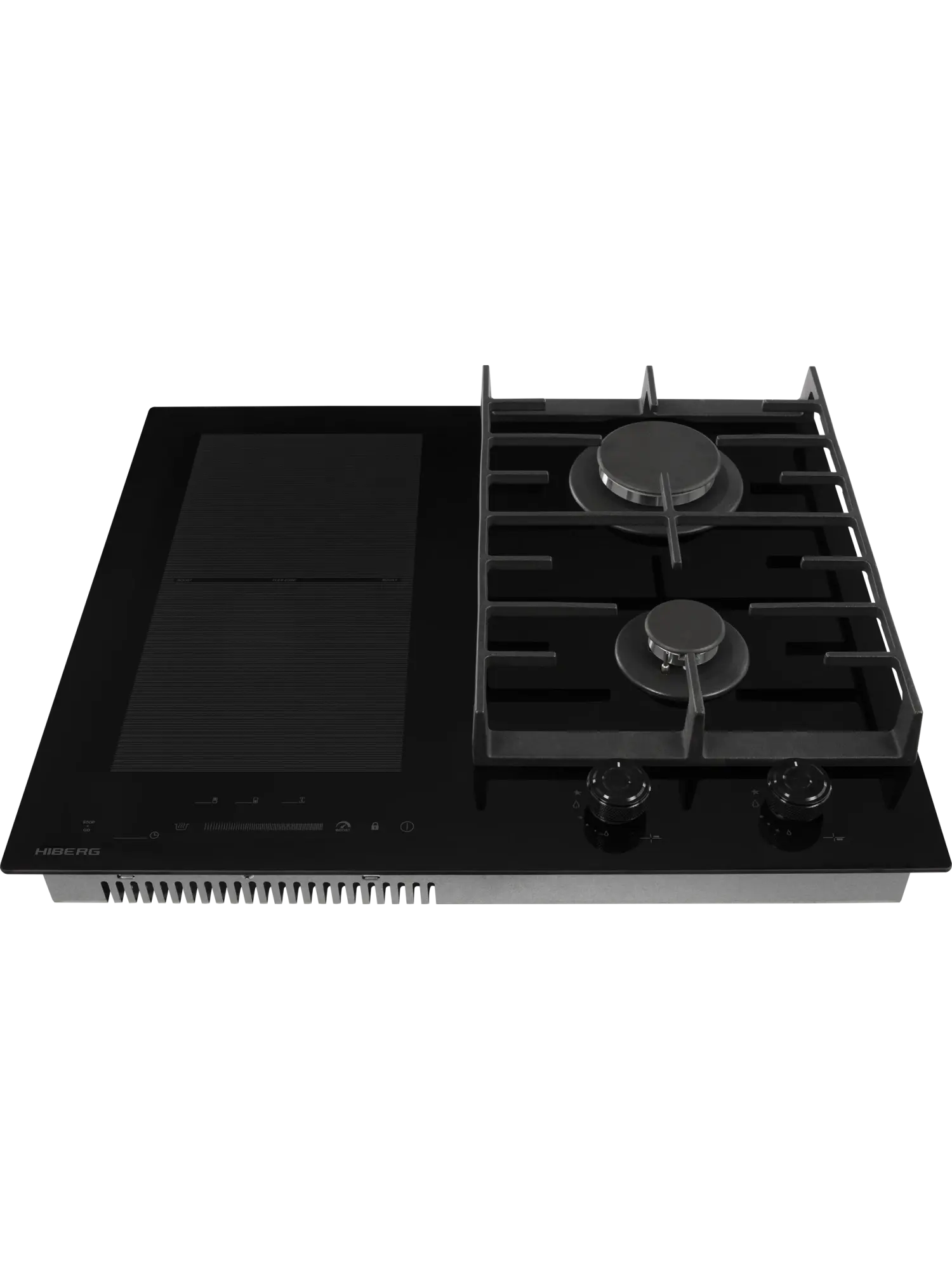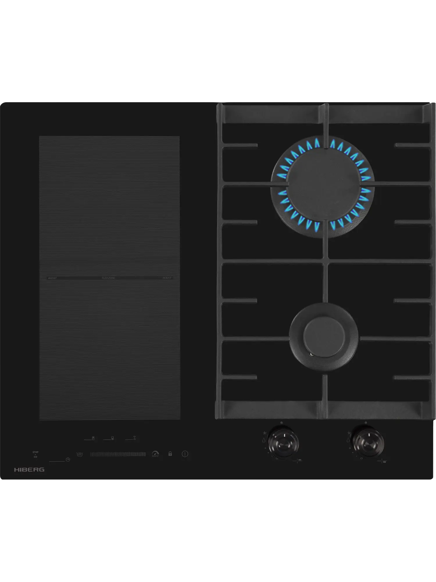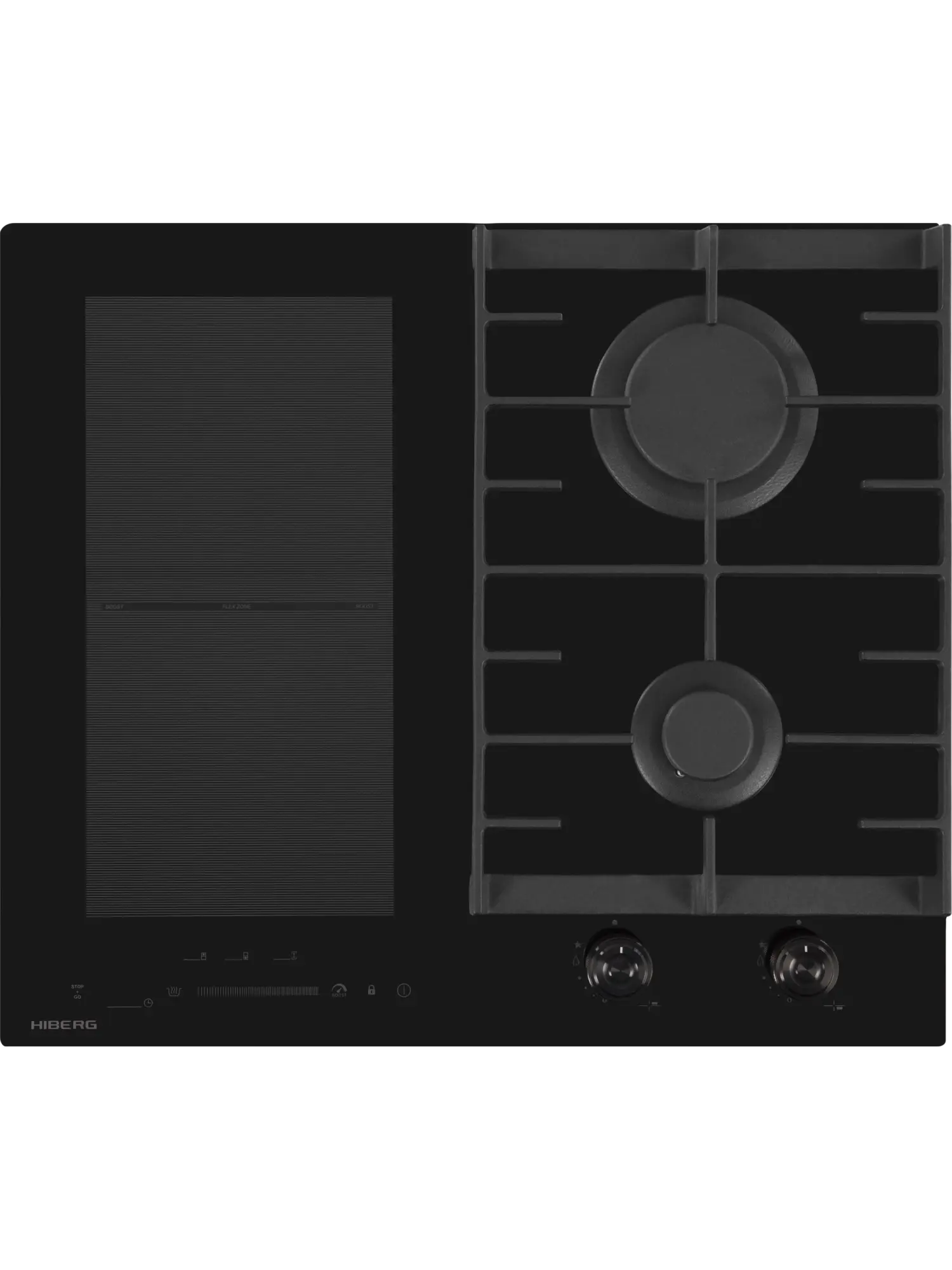 Комбинированная варочная поверхность HIBERG i-VM 6021 B выполнена из стеклокерамики черного цвета и оснащена 2 газовыми конфорками и 2 индукционными с возможностью объединения зон.