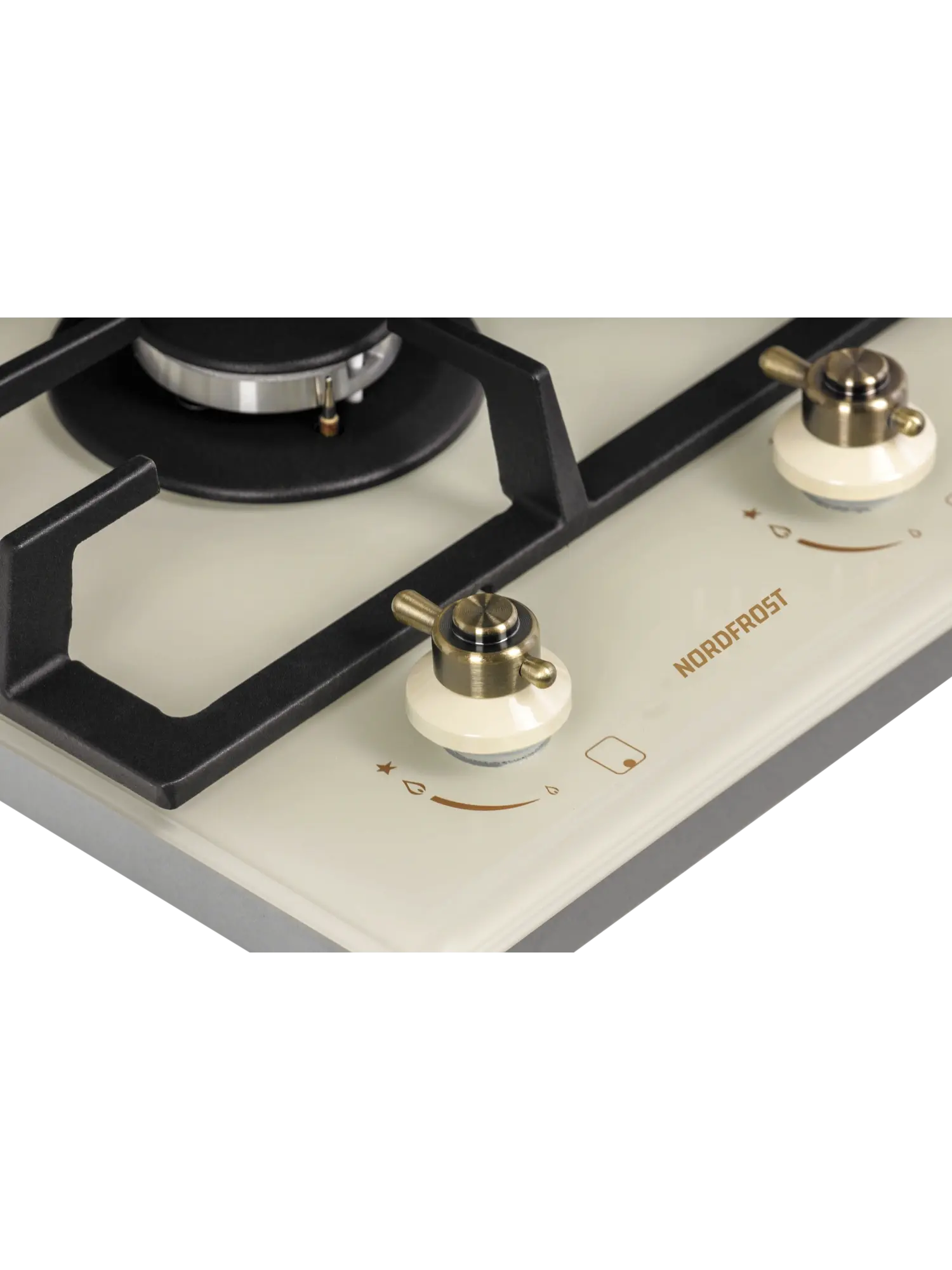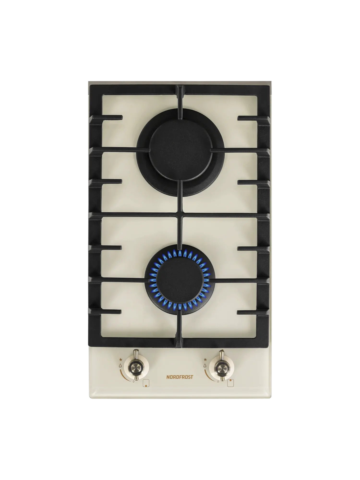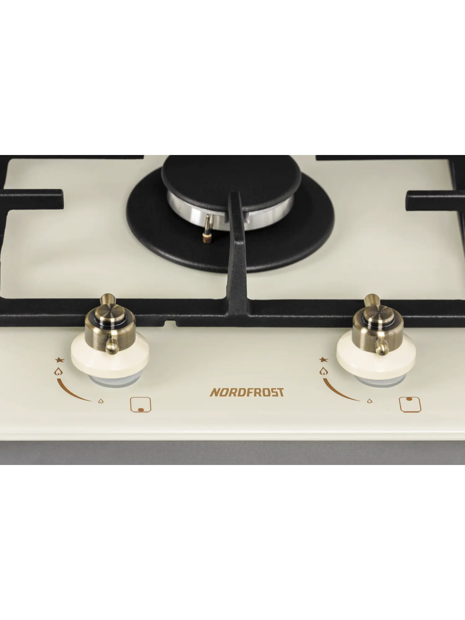 Газовая варочная поверхность Nord HM 3023 RY выполнена из закаленного стекла в бежевом цвете, оснащена двумя конфорками с газовым подключением, функцией газ-контроль и автоматическим электророзжигом от ручек.