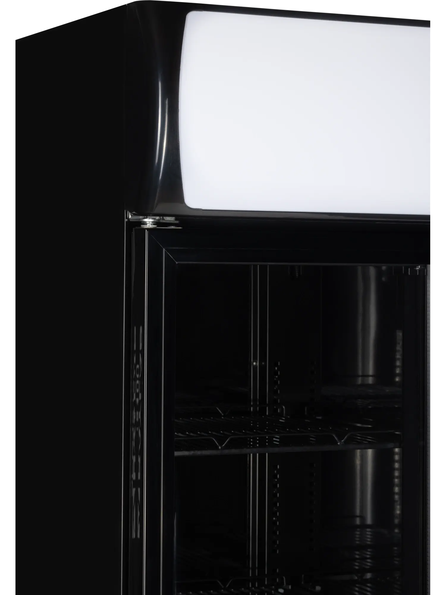 Яркое LED-освещение внутри камеры и в верхнем лайтбоксе равномерно подсвечивает продукцию, делая её ещё более заметной и привлекательной. Верхний лайтбокс подходит для размещения логотипа или рекламного сообщения, усиливая узнаваемость вашего бренда.