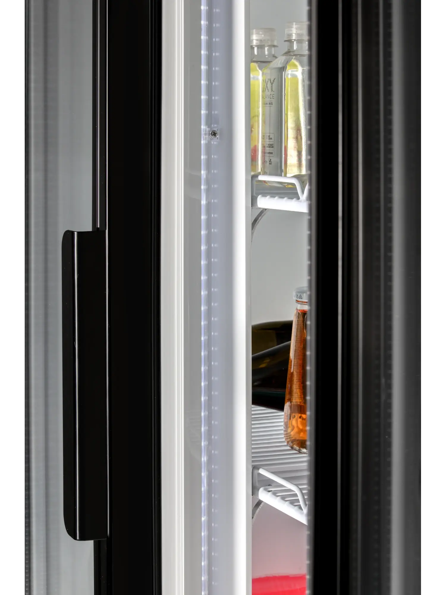 Современный, премиальный дизайн модели создаёт ощущение легкости и элегантности. Ультратонкая дверная рама и двухслойное закаленное стекло визуально раскрывают витрину, делая акцент на товаре, а не на конструкции. Обновленная металлическая решетка с улучшенной фиксацией обеспечивает не только стильный внешний вид, но и надежную защиту.