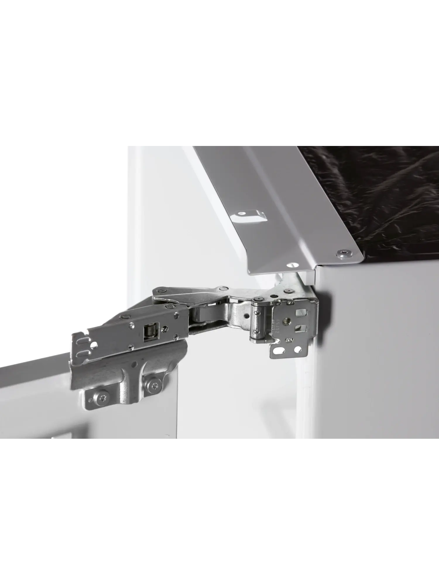 Модель имеет жесткую систему крепления фасадов с фиксированными петлями. При таком монтаже фасады совершенно не связываются с корпусом холодильника. Конструкция имеет высокую жесткость, не ограничена углом открывания и не имеет зазоров, в которых может скапливаться пыль и грязь.