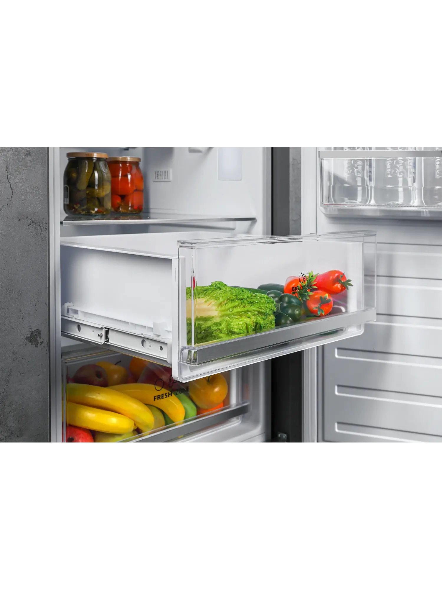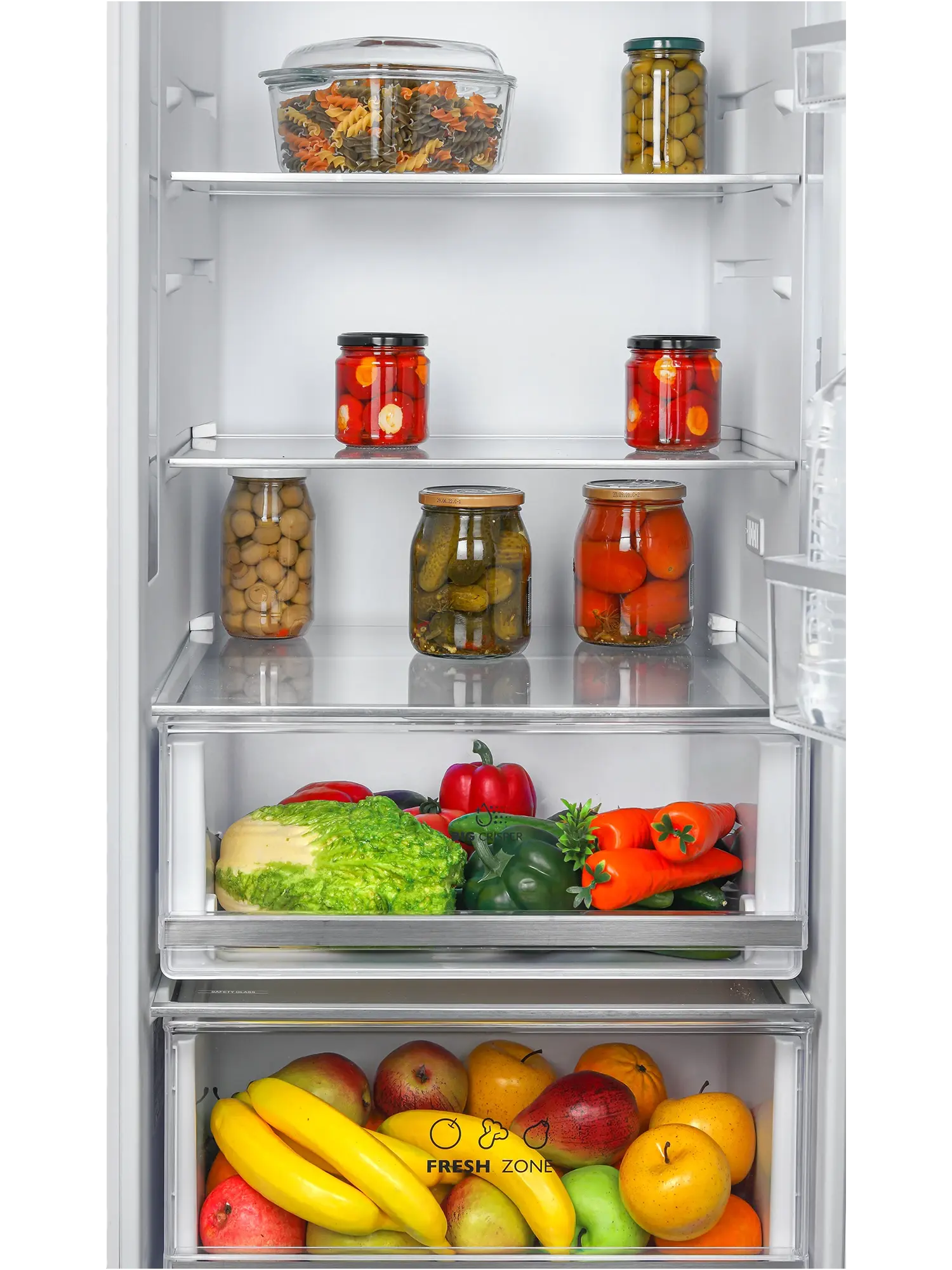 В модели предусмотрены ящики для хранения овощей и фруктов. Полки выполнены из закаленного стекла, их можно легко извлечь и очистить.