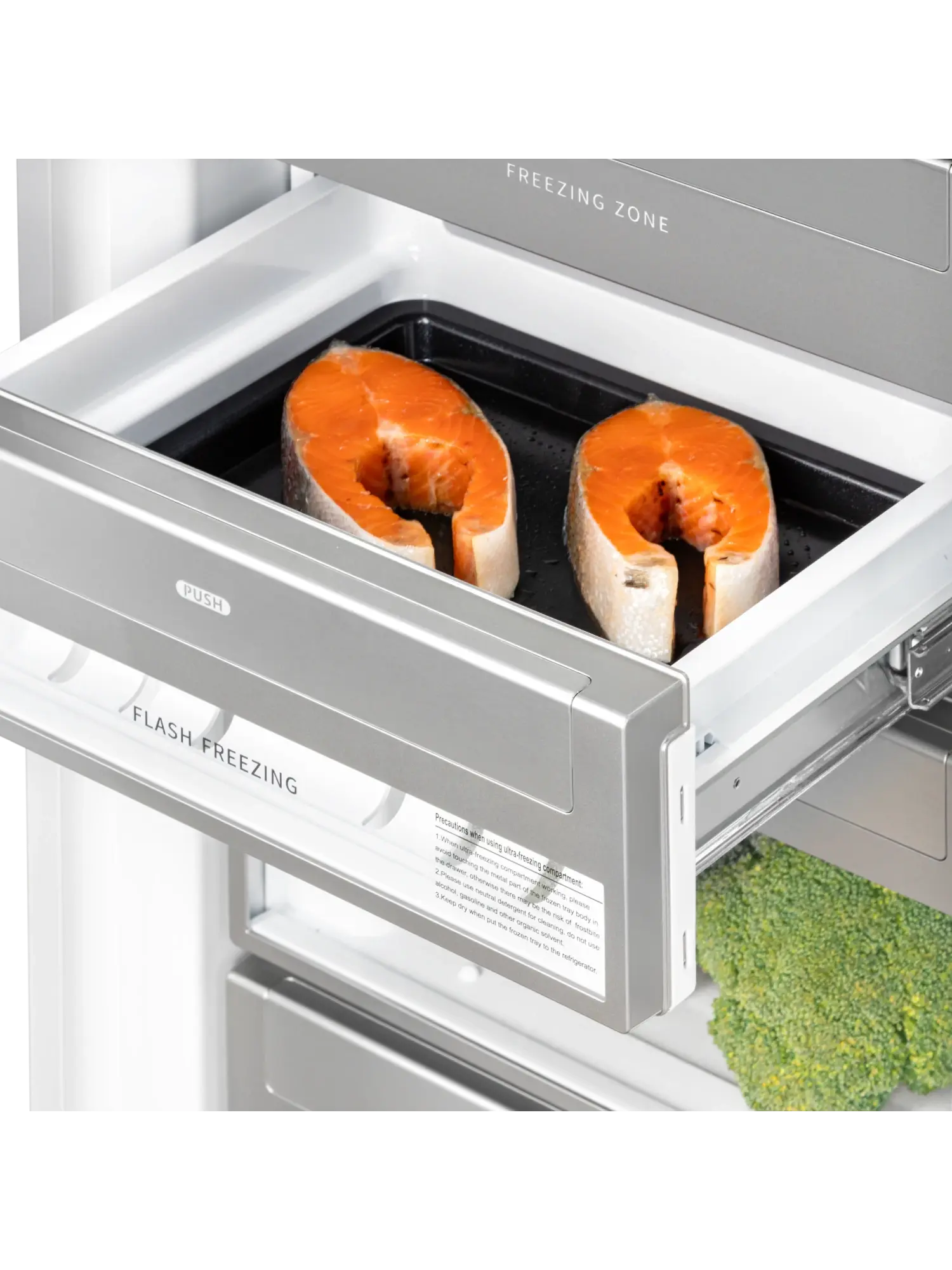 Уникальная особенность S-RFS 800 — наличие FLEX ZONE. Это ящик с индивидуальной зоной охлаждения, в котором можно настраивать температуру -4 °С, 0 °С или 4 °С. Такое отделение предназначено для длительного хранения самых разных продуктов: от детского питания до красной икры. Это незаменимое решение, если не хочется замораживать продукты, но употребить их вы планируете только через несколько дней. В зависимости от выбранной температуры во FLEX ZONE меняется подсветка: она может быть оранжевой, зеленой или голубой.